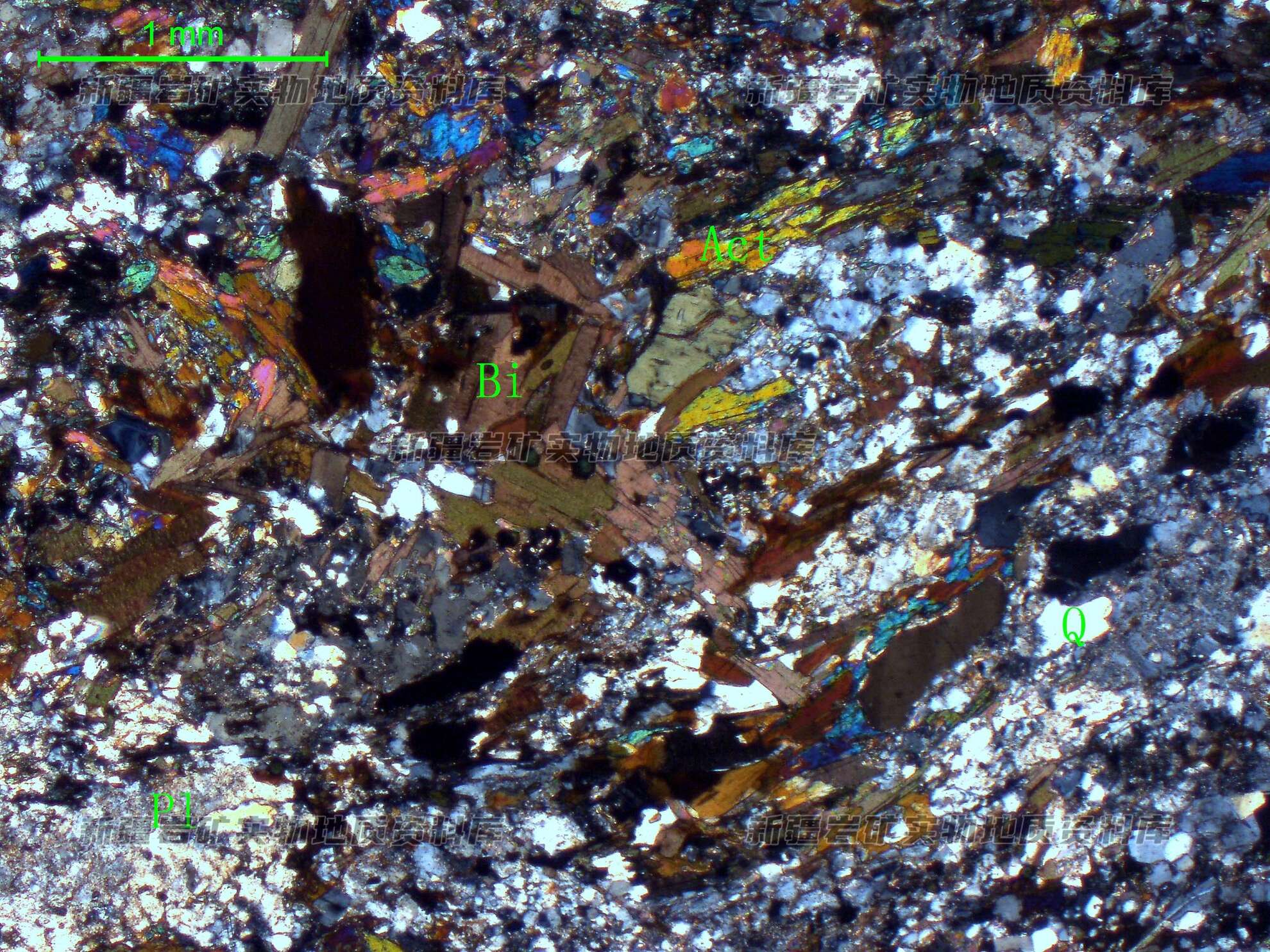 岩石特征描述: 斜长石(Pl)为他形粒状,表面泥化,石英(Q)呈他形粒状,含量低,阳起石(Act)呈他形粒状、柱状,定向分布斜长石之间,其间分布鳞片状黑云母(Bi)。
