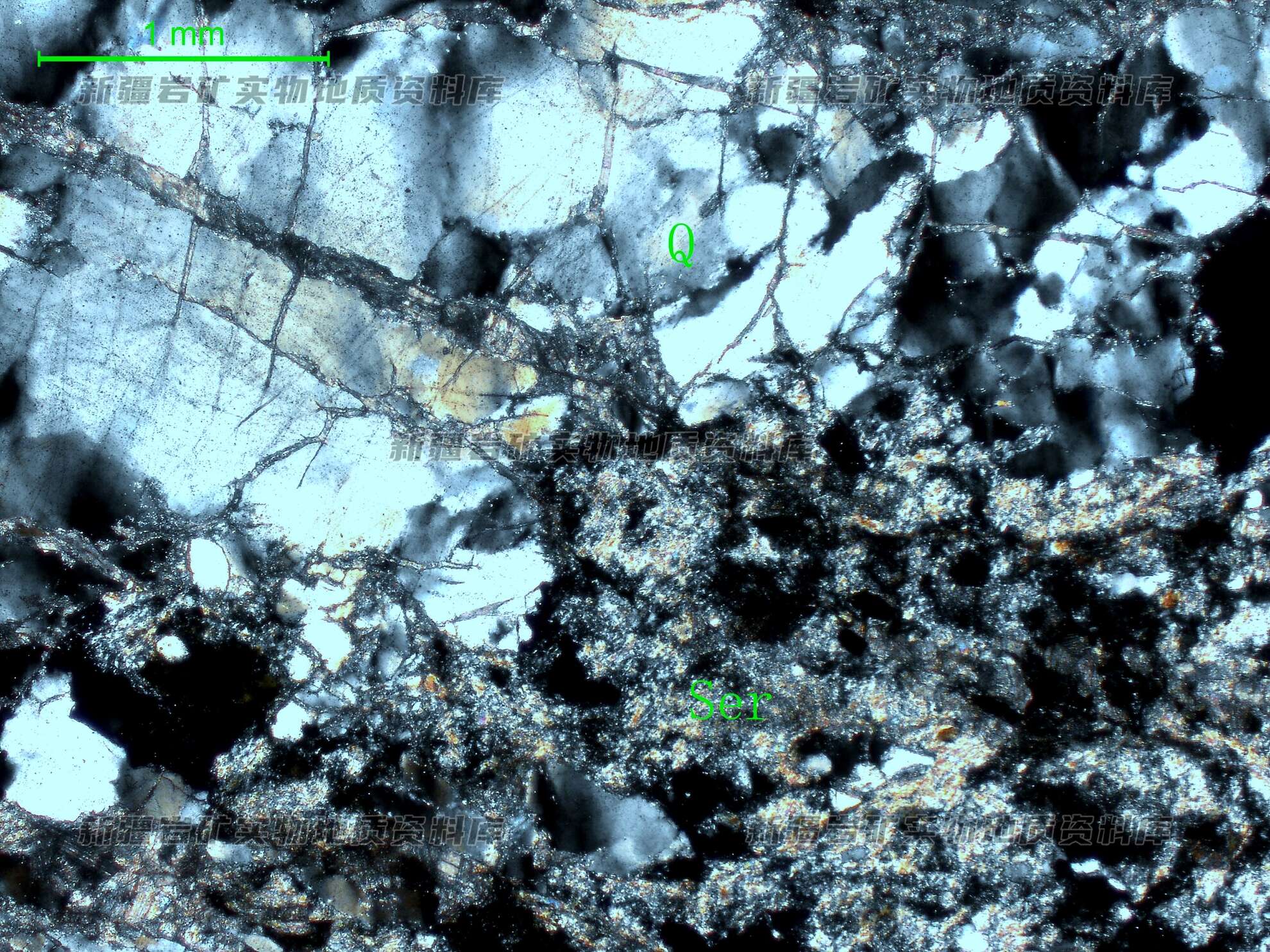 岩石特征描述: 岩石的原结构成分已不保留,由重结晶的鳞片状绢云母(Ser)组成,石英(Q)呈他形粒状、粒状集合体残留,多碎裂,沿裂纹被绢云母充填。