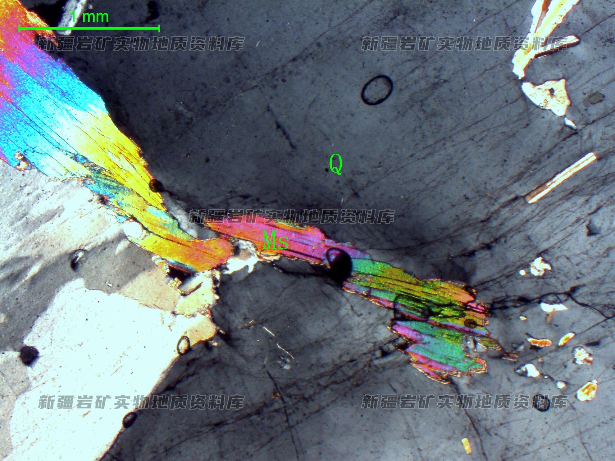 岩石特征描述: 薄片中的矿物以石英(Q)为主,石英呈他形粒状,粒径粗,白云母(Ms)呈半自形叶片状,分布石英之间。