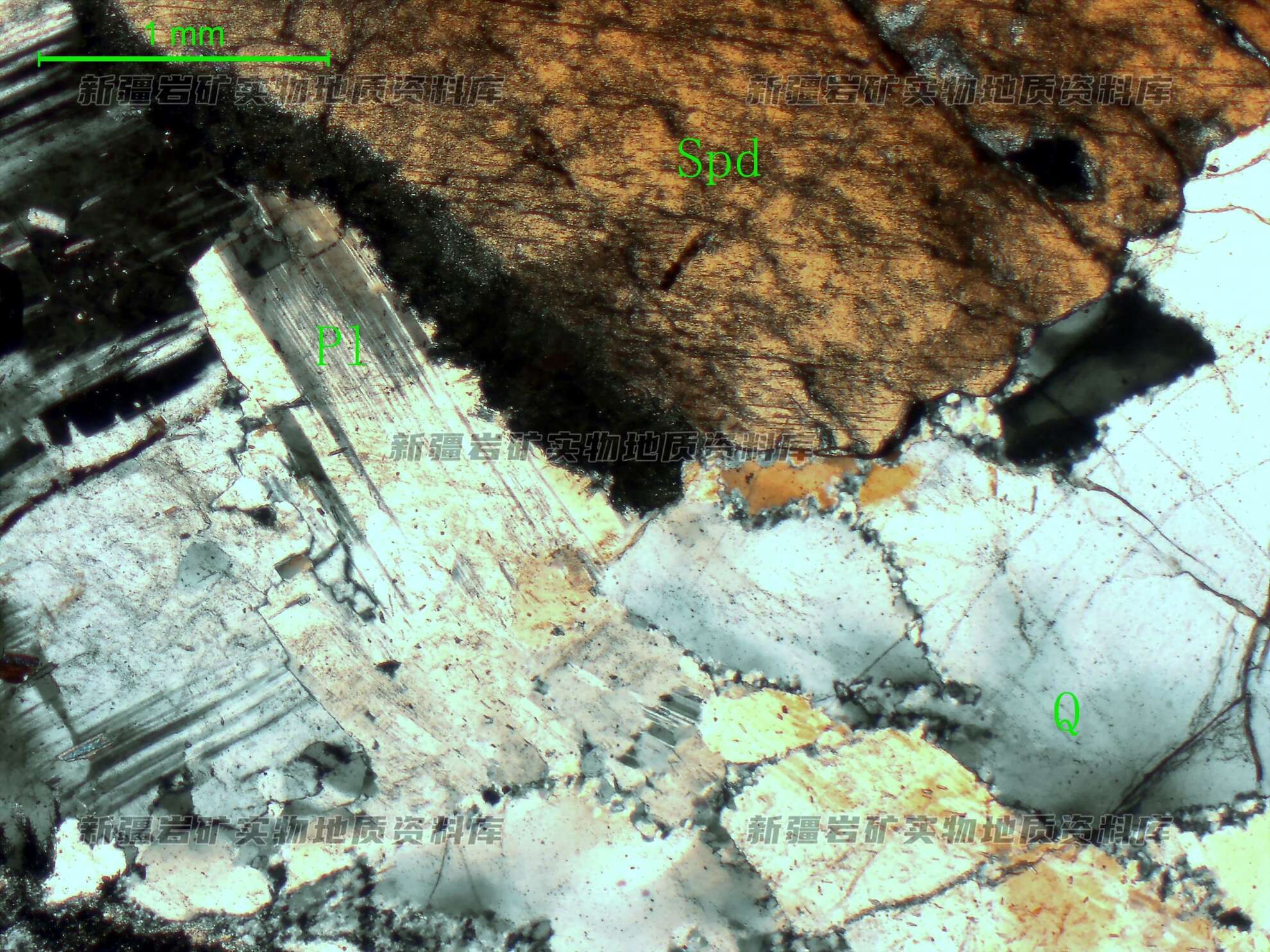 岩石特征描述: 斜长石(Pl)呈半自形粒状,具碎裂纹,为更长石,石英(Q)呈他形粒状,碎裂并具波状消光,锂辉石(Spd)呈自形柱状,不均匀分布在石英、斜长石之间。