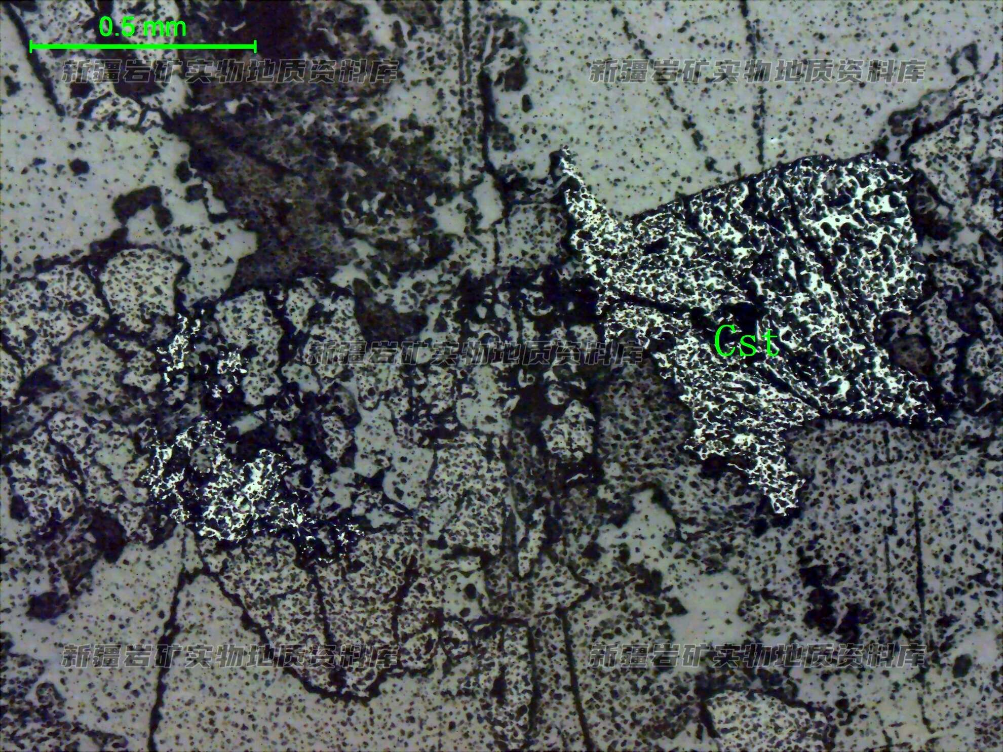 岩石特征描述: 镜下局部可见锡石(Cst),呈他形粒状,呈散粒状较集中分布在透明矿物中,粒度在0.02-0.72mm,表面多麻点。