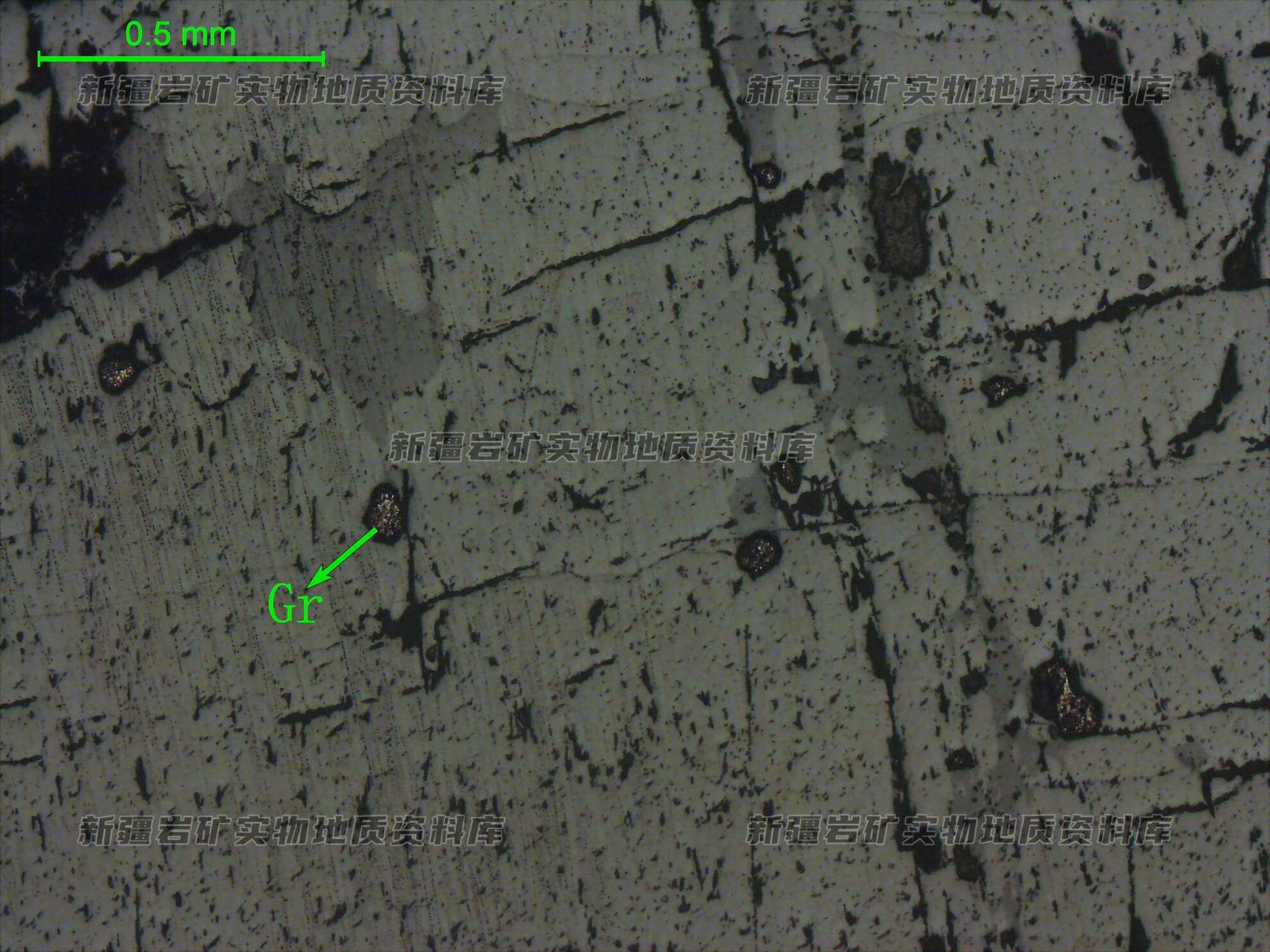 岩石特征描述: 光片中不透明矿物微少,局部可见细小石墨(Gr)晶粒,呈他形粒状,不均匀散粒状分布透明矿物中。