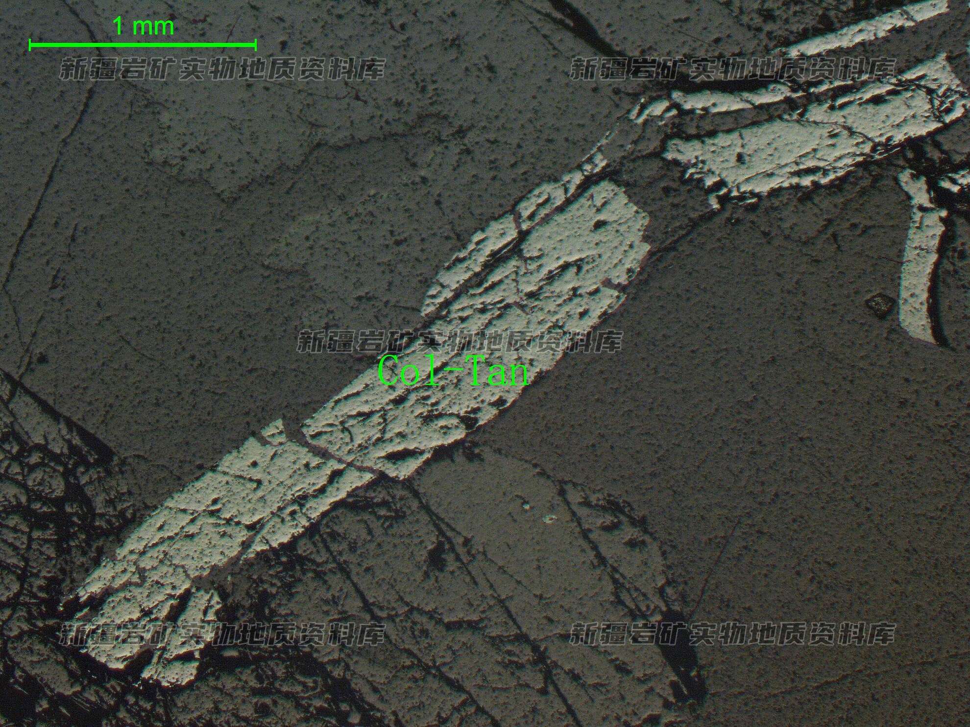 岩石特征描述: 镜下可见铌钽铁矿(Col-Tan)呈半自形长板状,分布在局部透明矿物间,粒度较粗。