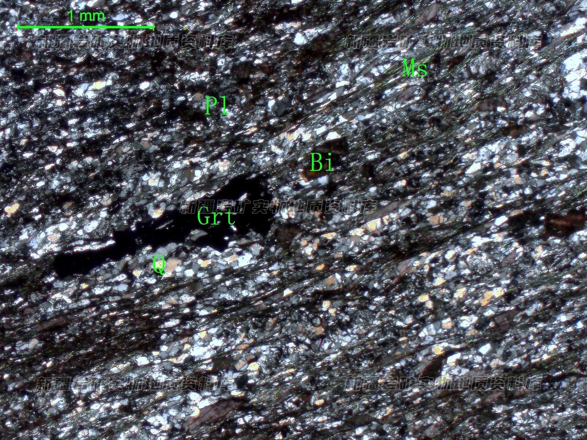 岩石特征描述: 斜长石(Pl)、石英(Q)呈他形粒状集合体平行定向分布,其间分布细条纹状白云母(Ms)、黑云母(Bi),形成片理构造,其中可见碎裂拉长的石榴石(Grt)分布。