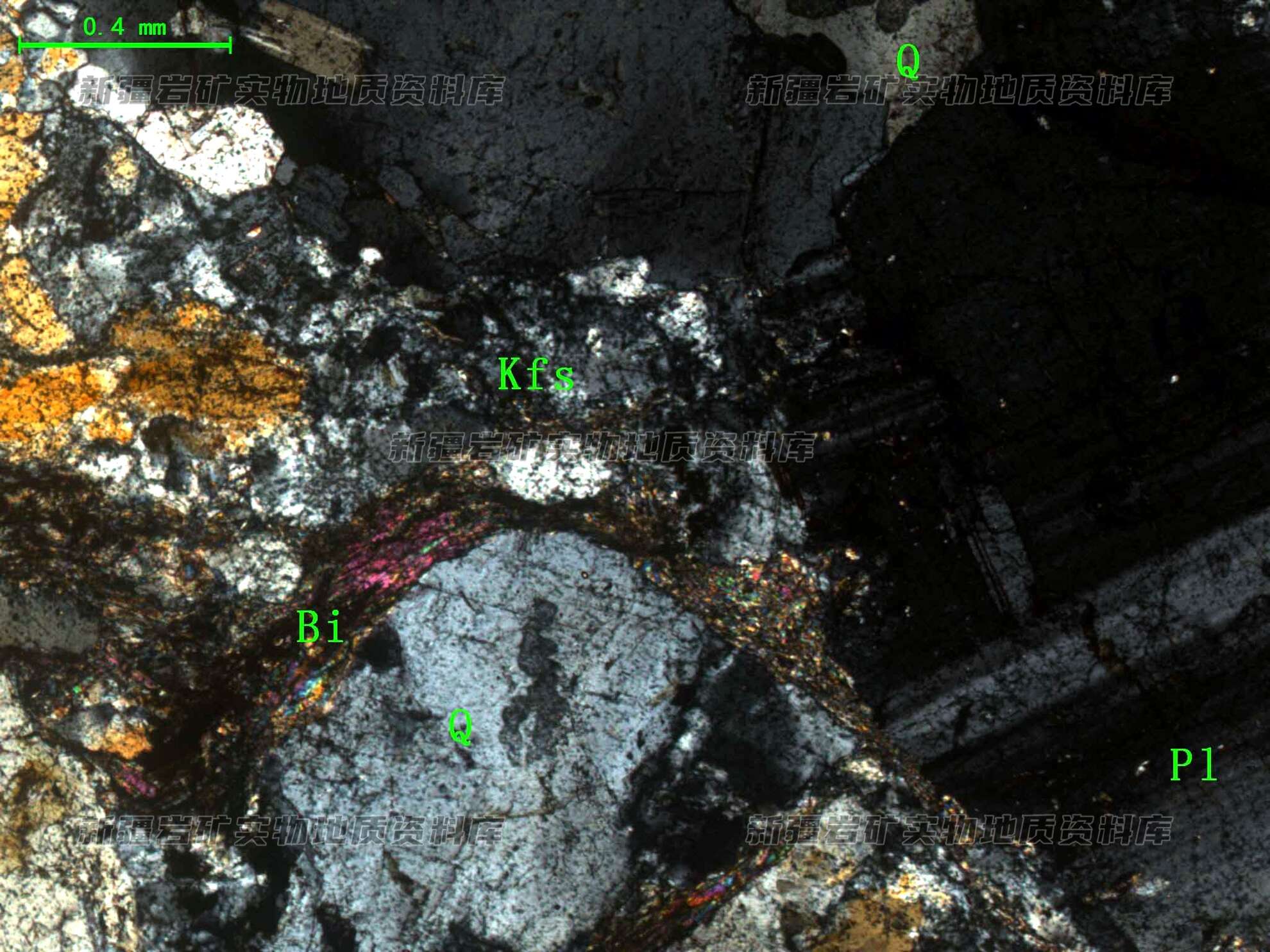 岩石特征描述: 岩石主要由粒状斜长石(Pl)、钾长石(Kfs)、石英(Q)和少量黑云母(Bi)组成,矿物多见明显蚀变并碎裂。