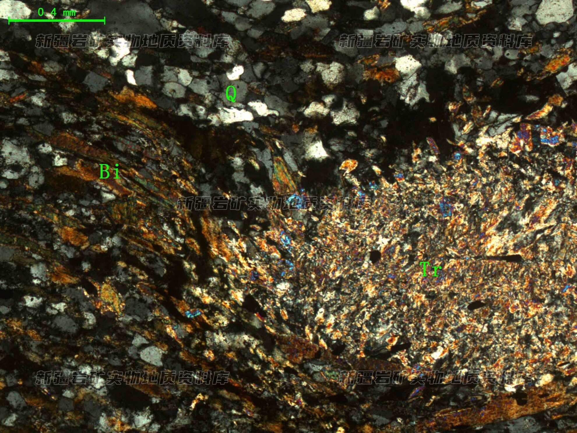 岩石特征描述: 岩石主要由石英(Q)、黑云母(Bi)和少量透闪石(Tr)组成,纤状透闪石(Tr)集合体呈团块状分布长英矿物粒间。