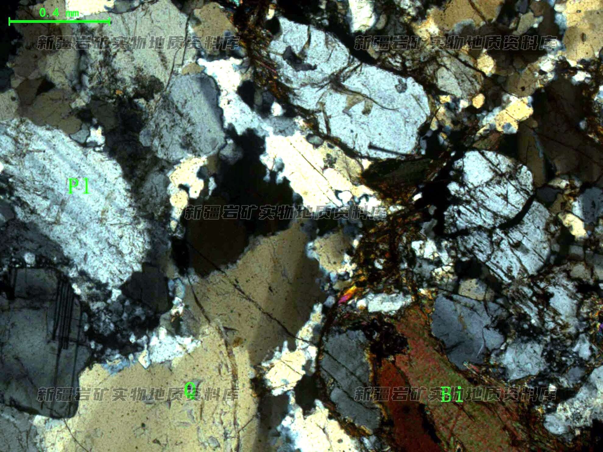 岩石特征描述: 岩石主要由斜长石(Pl)、石英(Q)和少量黑云母(Bi)组成,矿物碎裂并具轻度蚀变。