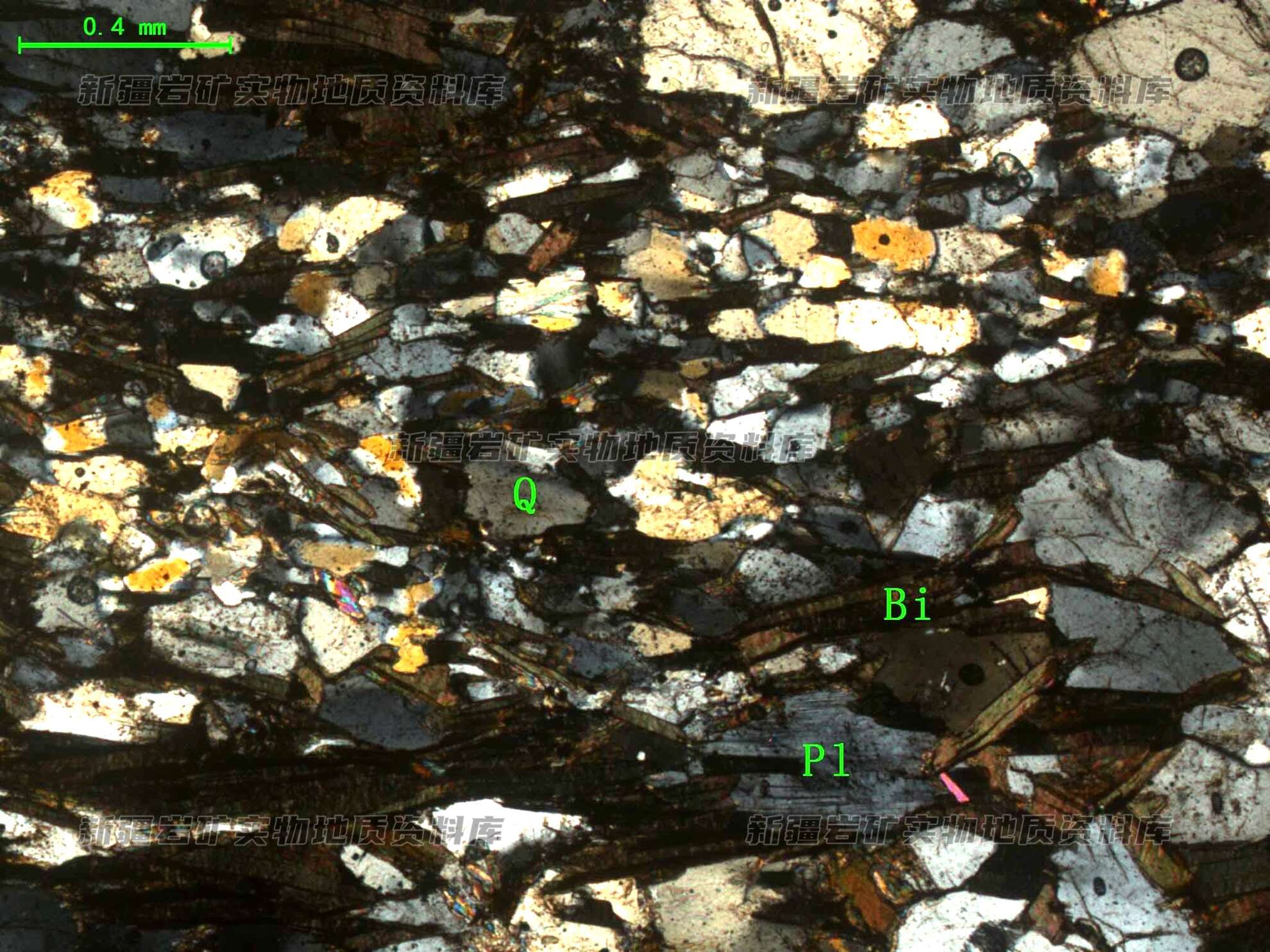 岩石特征描述: 岩石主要由石英、黑云母(Bi)和少量斜长石(Pl)组成。石英(Q)呈压扁拉长沿长轴定向分布,黑云母(Bi)呈云母鱼状定向分布石英粒间。