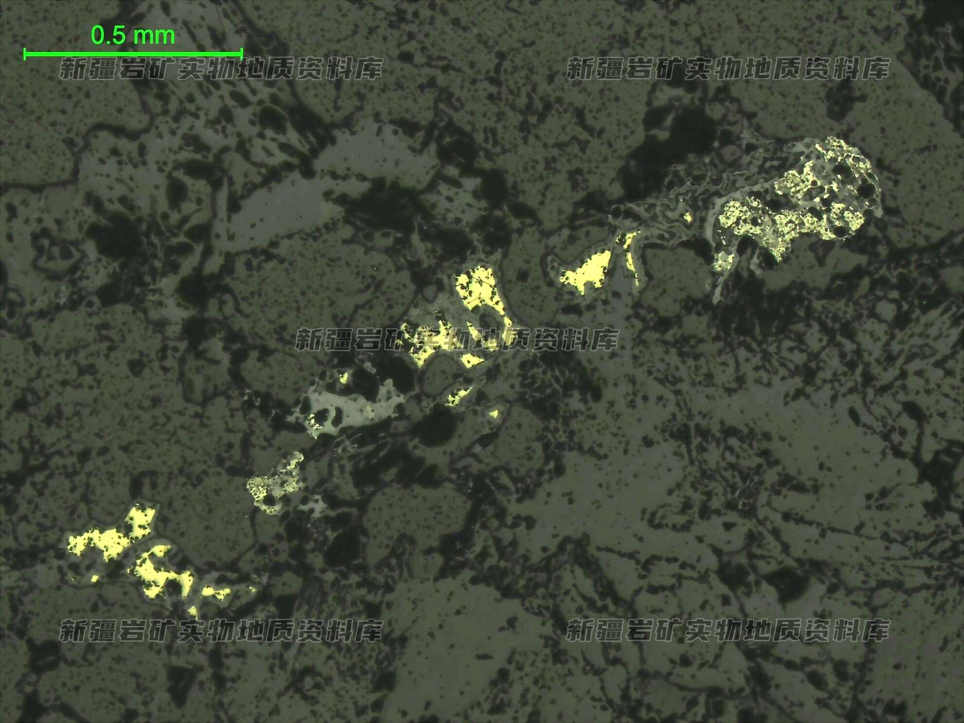岩石特征描述: 光片中金属矿物主要为黄铜矿,次有少量黄铁矿,黄铜矿和黄铁矿都强烈褐铁矿化,此外,可见孔雀石脉。
