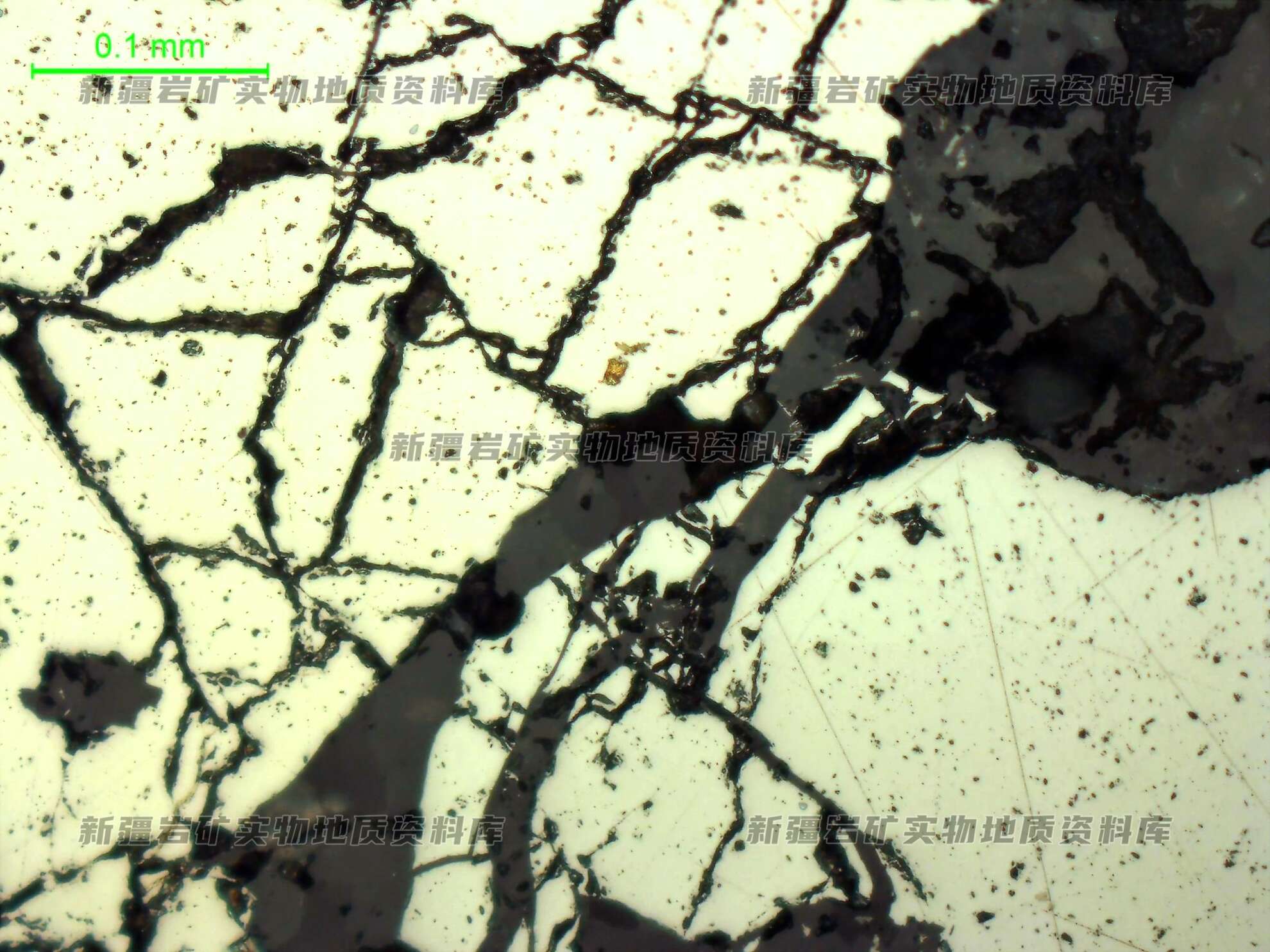 光片中见数粒自然金,粒径微小0.01mm左右,多呈他形粒状分布在毒砂粒内;黄铜矿呈他形分布在毒砂、黄铁矿粒内,含量甚微。