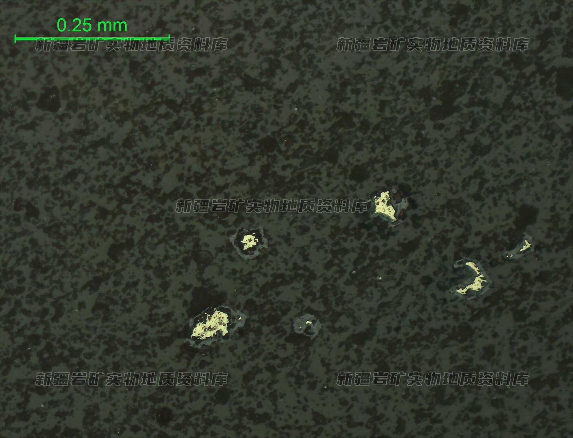 岩石特征描述: 光片中金属矿物主要为黄铁矿,多呈半自形、自形粒状,粒径0.01-0.3mm,单晶星散状分布在透明矿物粒间,含量约2%;黄铁矿边缘多褐铁矿化,有的已完全蚀变为褐铁矿,仅保留黄铁矿外形,含量约1%。