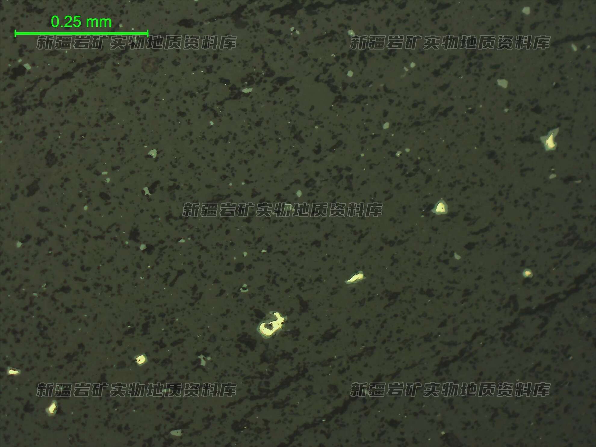 岩石特征描述: 光片中金属矿物主要为黄铁矿,多呈细小的半自形、他形粒状,粒径多在0.005-0.1mm,个别可达0.3mm,单晶星散状分布在透明矿物粒间,黄铁矿边缘多褐铁矿化,有的已完全蚀变为褐铁矿,仅保留黄铁矿外形,含量约1%。