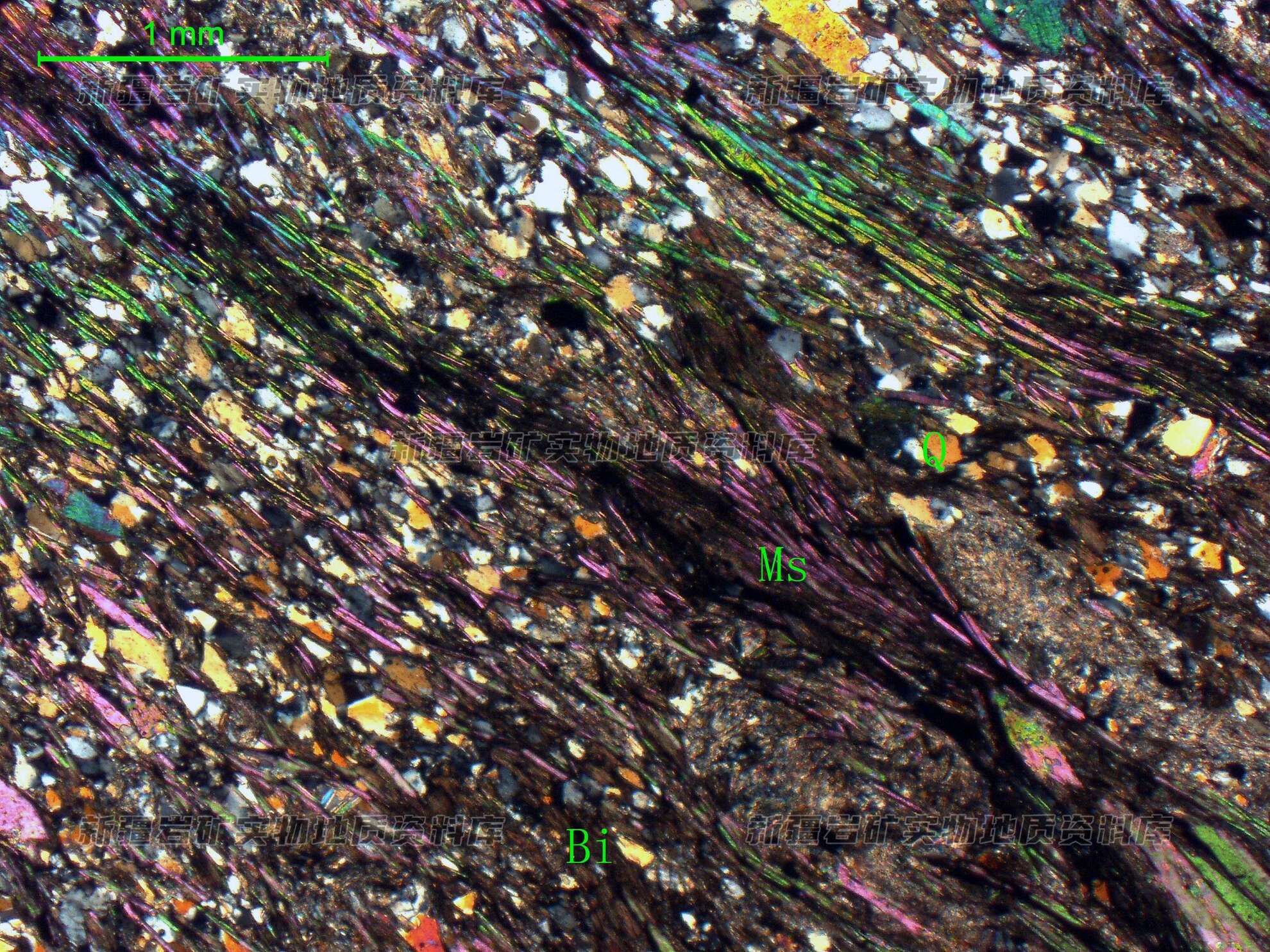 岩石特征描述: 石英(Q)呈他形粒状,长轴平行定向分布,黑云母(Bi)、白云母(Ms)呈鳞片状,拉长变形,呈细条带状分布石英之间。