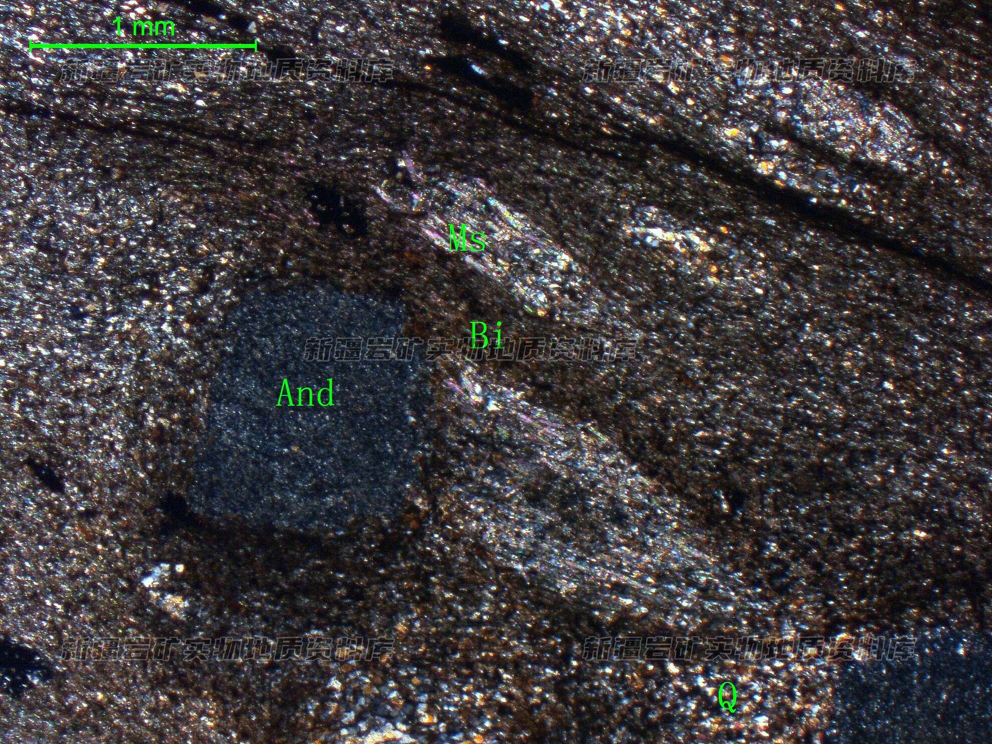 岩石特征描述: 黑云母(Bi)、白云母呈细鳞片状,平行定向分布与石英(Q)之间,部分白云母(Ms)呈透镜体状集合体,红柱石(And)呈自形四面体状,变斑晶状,具强绢云母化。