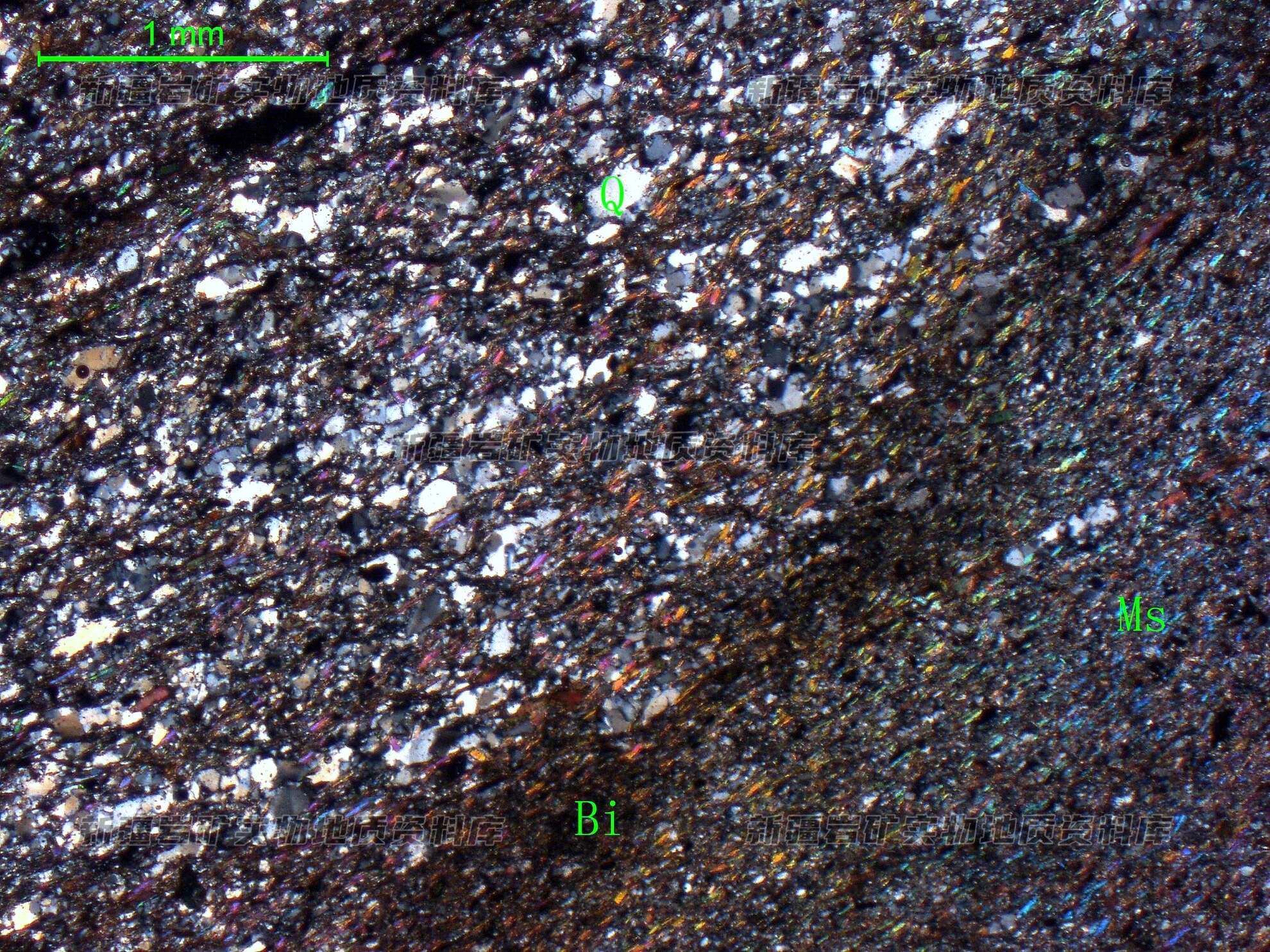 岩石特征描述: 石英(Q)呈微晶状集合体,细透镜状平行定向分布,具波状消光,云母结晶较微细,呈细鳞片状、线缕状分布石英之间,黑云母(Bi)、白云母(Ms)相互混合,并发生形变。