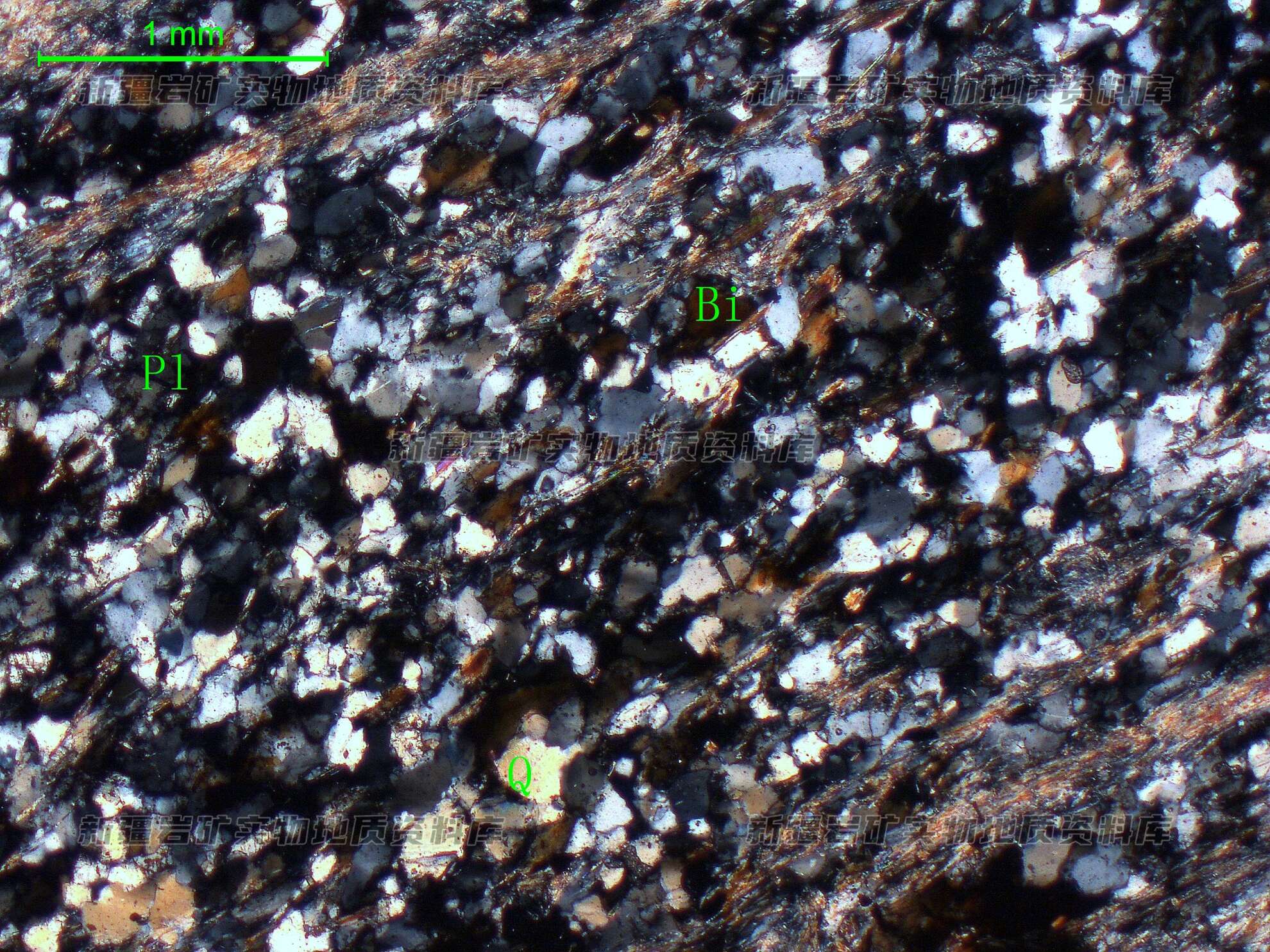 岩石特征描述: 石英(Q)、斜长石(Pl)呈他形粒状,长轴定向分布,其间定向分布鳞片状黑云母(Bi)及少量白云母、透闪石的长纤维集合体细条带。