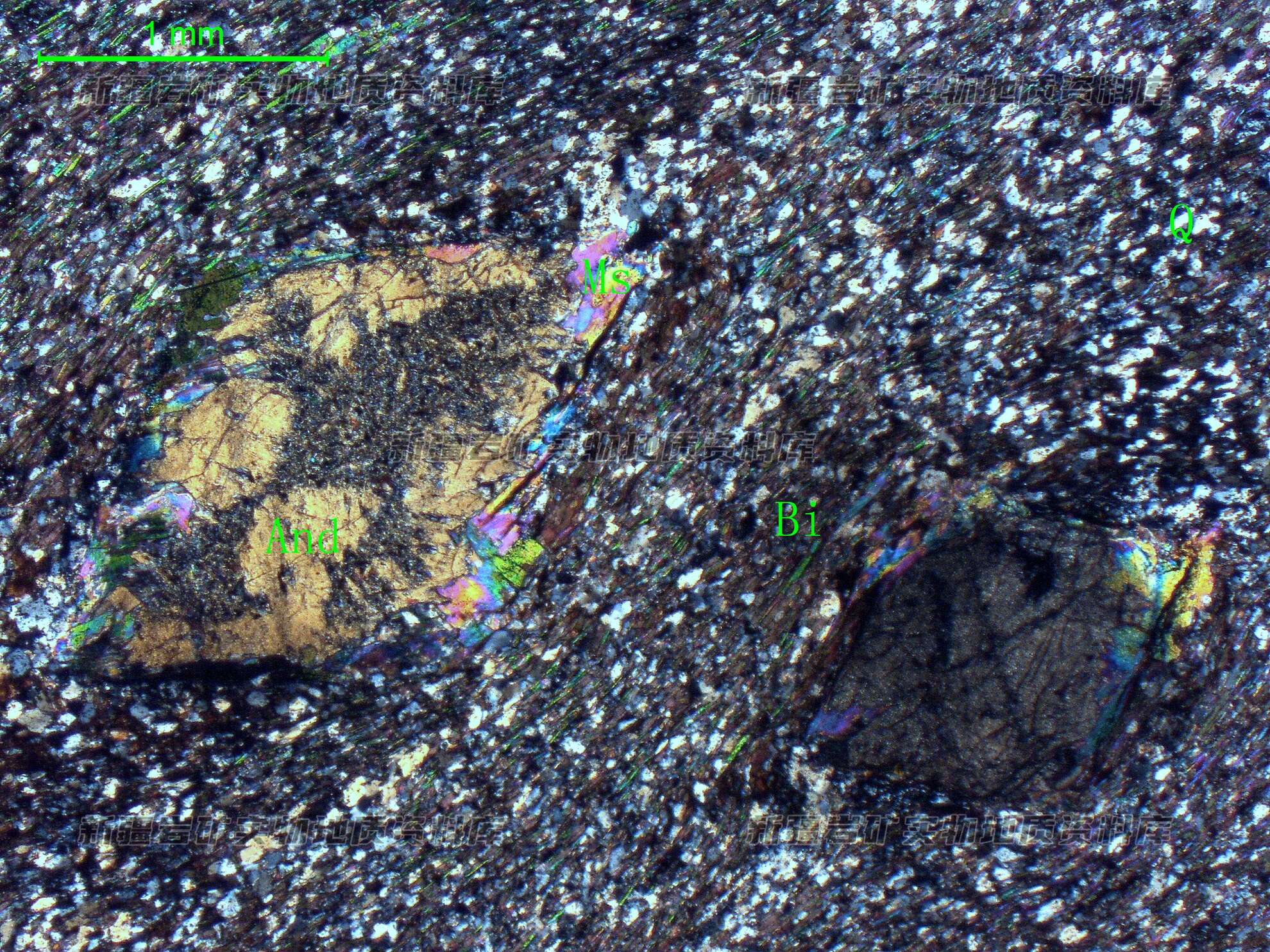 岩石特征描述: 石英(Q)、斜长石呈他形粒状,长轴定向分布,黑云母(Bi)、白云母呈细鳞片状平行定向分布,呈片状构造,红柱石(And)呈自形四面体状、柱状呈变斑晶状,轻度绢云母化,白云母(Ms)呈集合体环边其边缘。