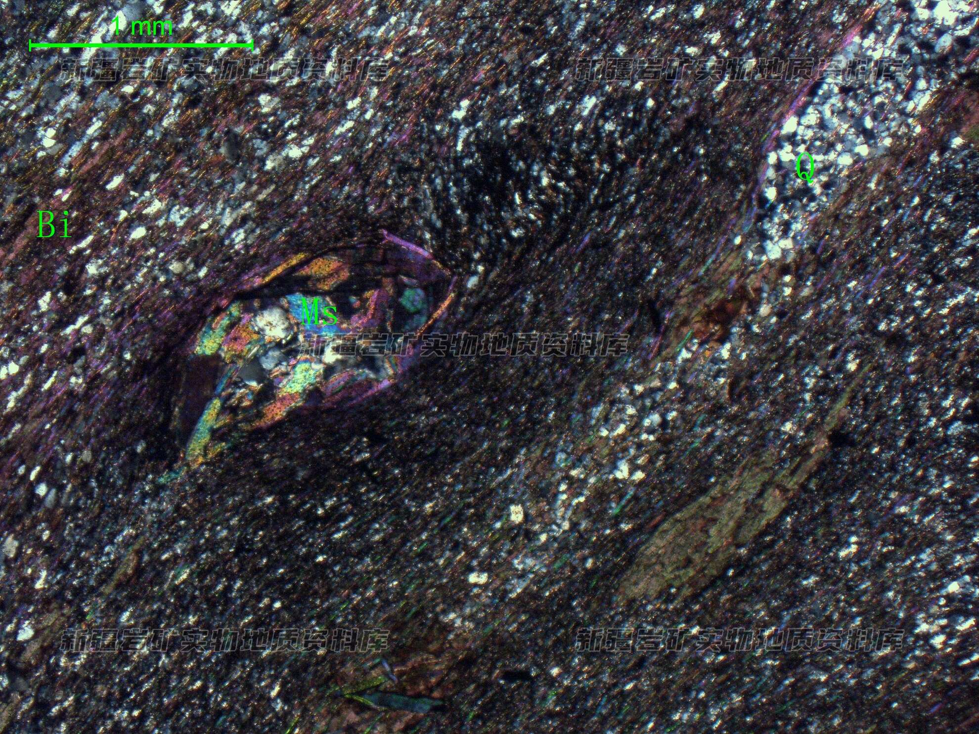岩石特征描述: 石英呈微粒状长轴平行定向分布,部分细粒状石英(Q)呈透镜状集合体,黑云母(Bi)呈鳞片状平行定向分布,具片状构造,部分白云母(Ms)呈集合体状分布,可能为红柱石蚀变产物。