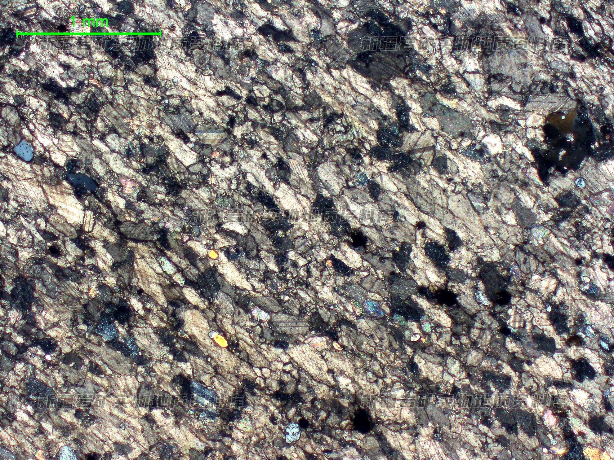 岩石被后期结晶较粗的碳酸盐脉穿切,脉宽0.5-1.5mm不等,方解石脉的方向与条带方向一致。