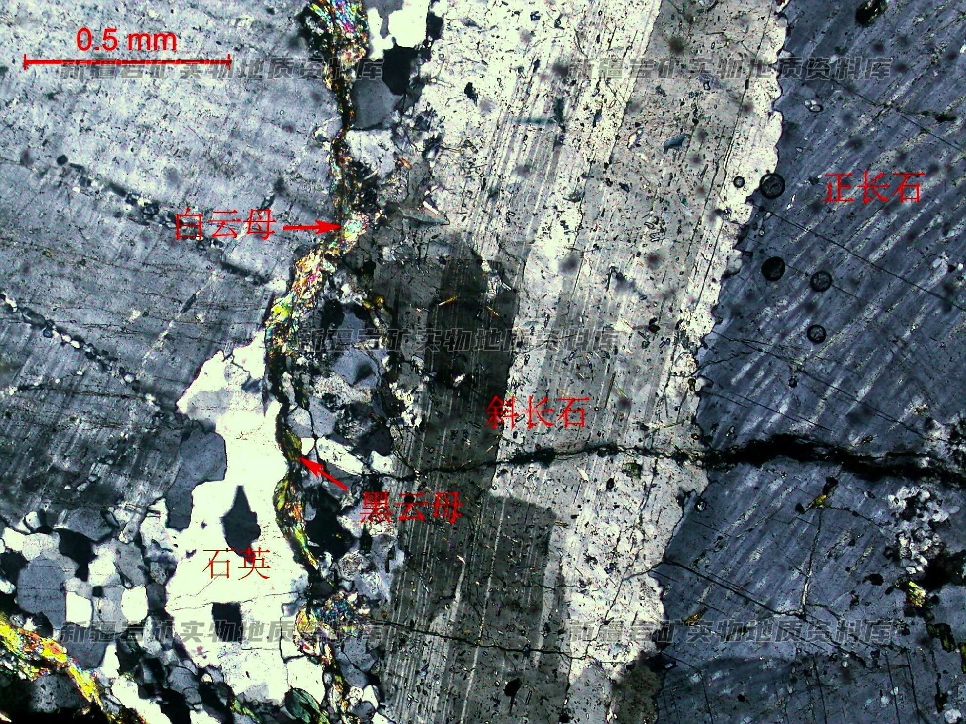 主要矿物及含量%: 钾长石37,斜长石30,石英28,黑云母4,白云母1,锆石个别,金属矿物微量