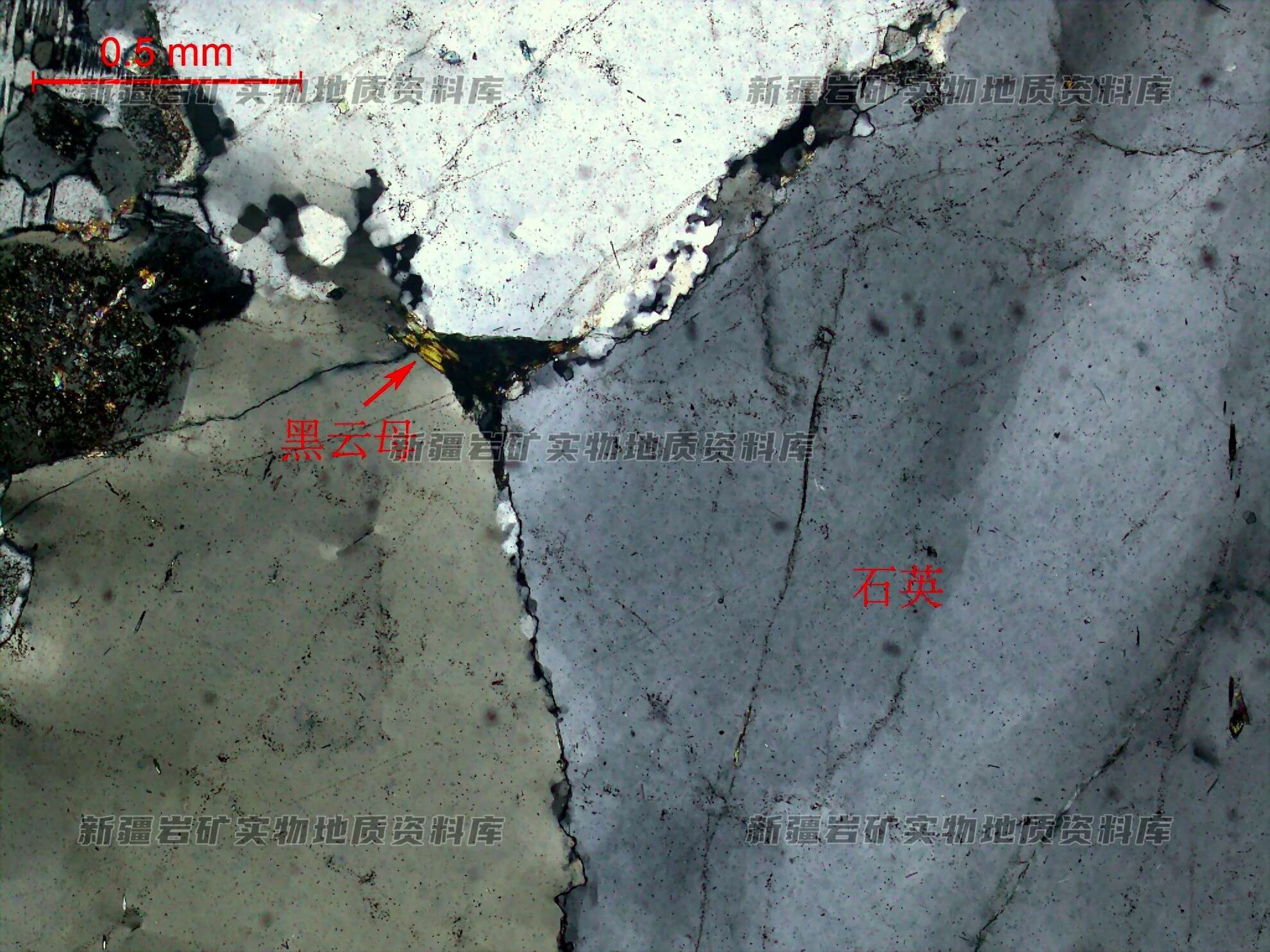 岩石特征描述: 石英波状消光,接触处有重结晶现象。