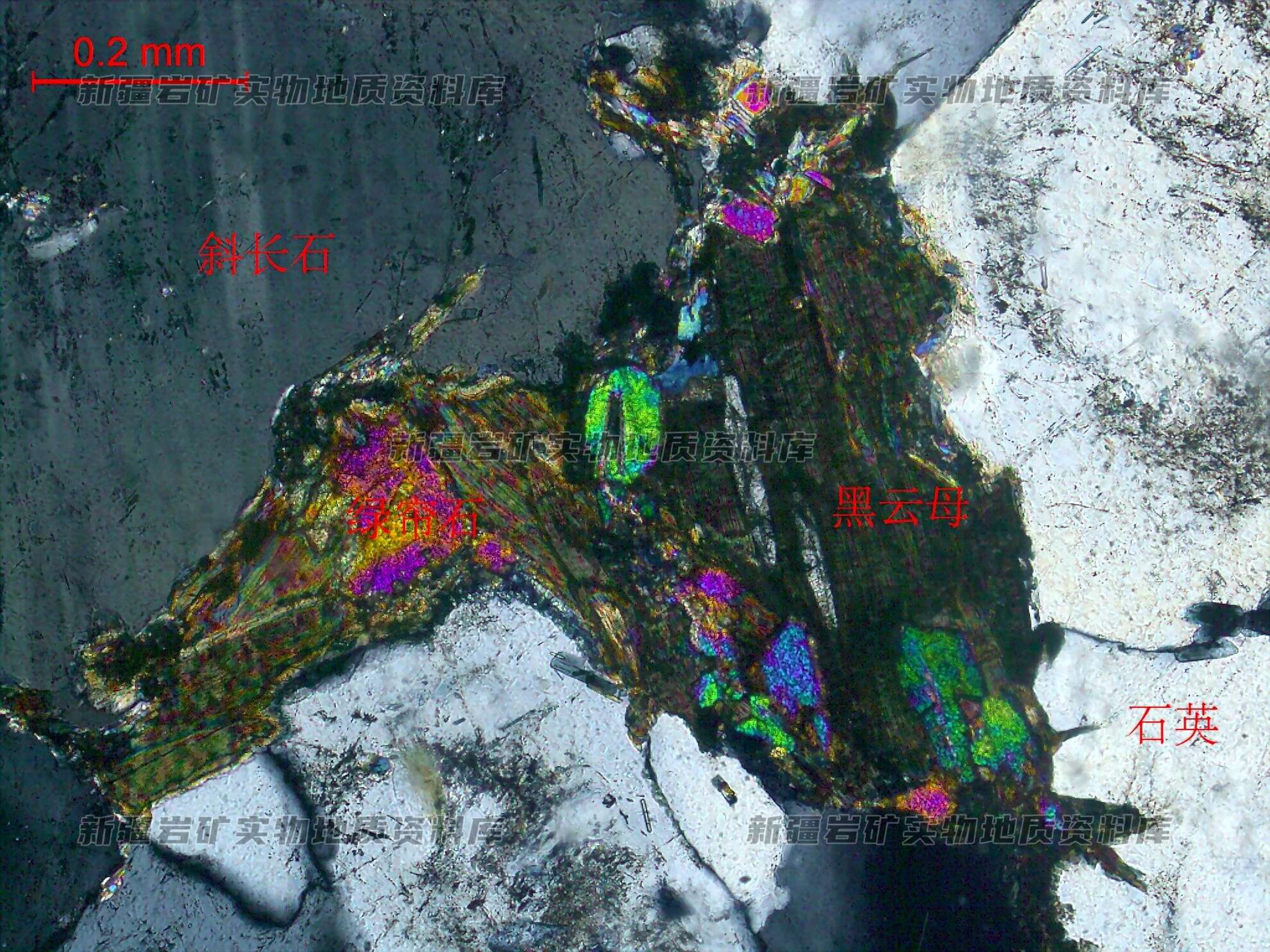 岩石中主要矿物为斜长石、石英,次为钾长石和黑云母,见少量白云母、金属矿物。