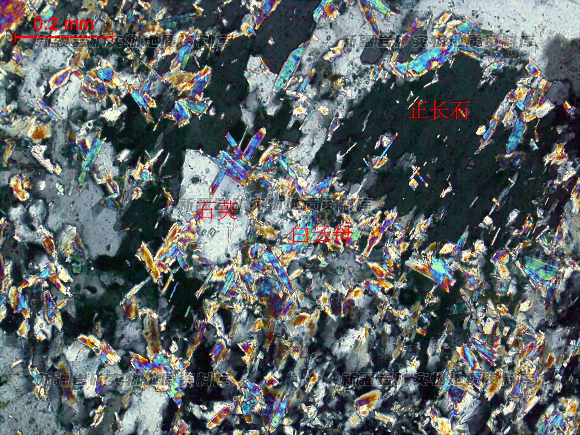 钾长石:含量约20%,粒径0.2-2.35mm,半自形粒状,分布于斜长石、石英间,被白云母、石英取代。