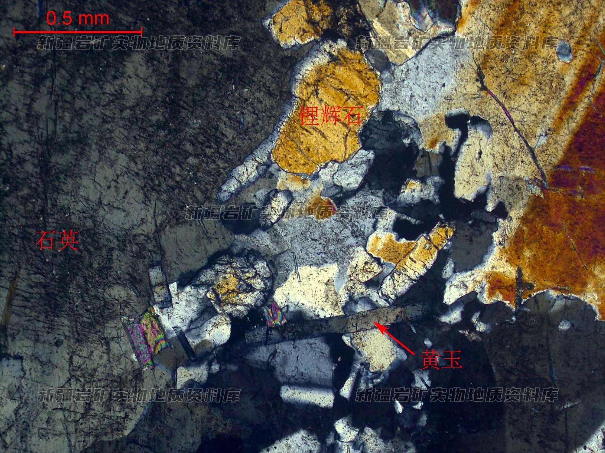 岩石特征描述: 黄玉半自形柱状,分布于石英间;锂辉石半自形柱状,分布于石英、长石间。