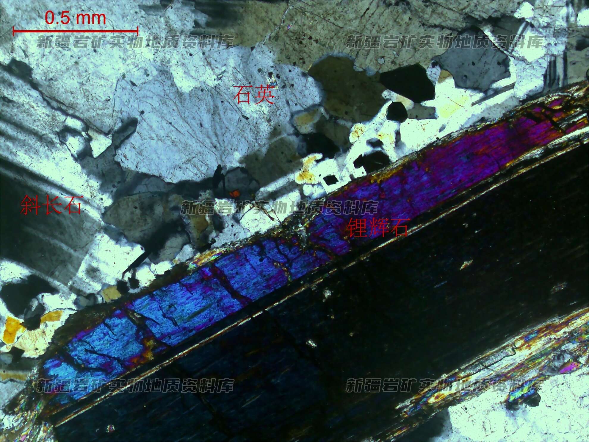 岩石特征描述: 锂辉石半自形柱状,其长轴定向分布于长石、石英间;斜长石半自形板状,聚片双晶常见;石英半自形粒状,表面较脏浊。