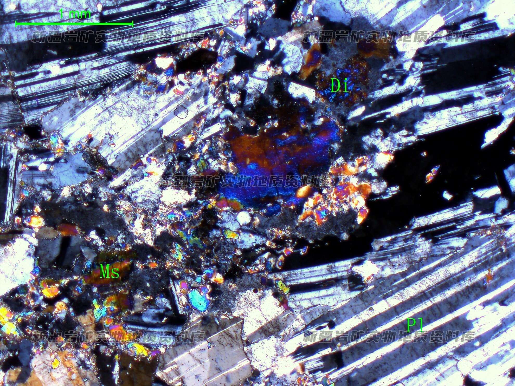 岩石特征描述: 镜下可见斜长石(Pl)呈半自形板状,微泥化,粒度大小不等,具定向分布,其间分布少量他形粒状透辉石(Di)及鳞片状白云母(Ms)。