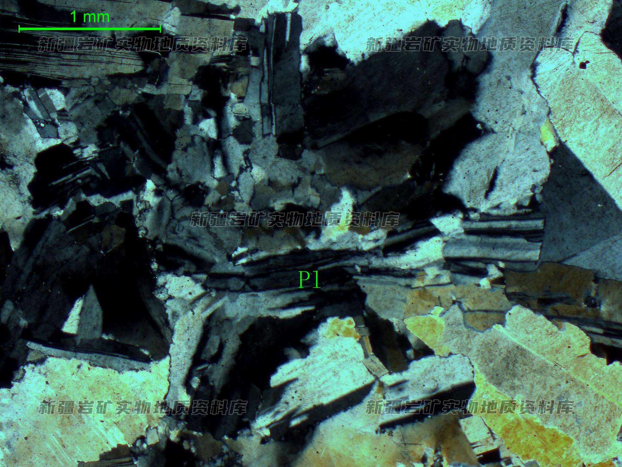 岩石特征描述: 镜下可见斜长石(Pl)呈半自形板状,较干净,大部分具大致定向分布,粒径粗细不均匀。