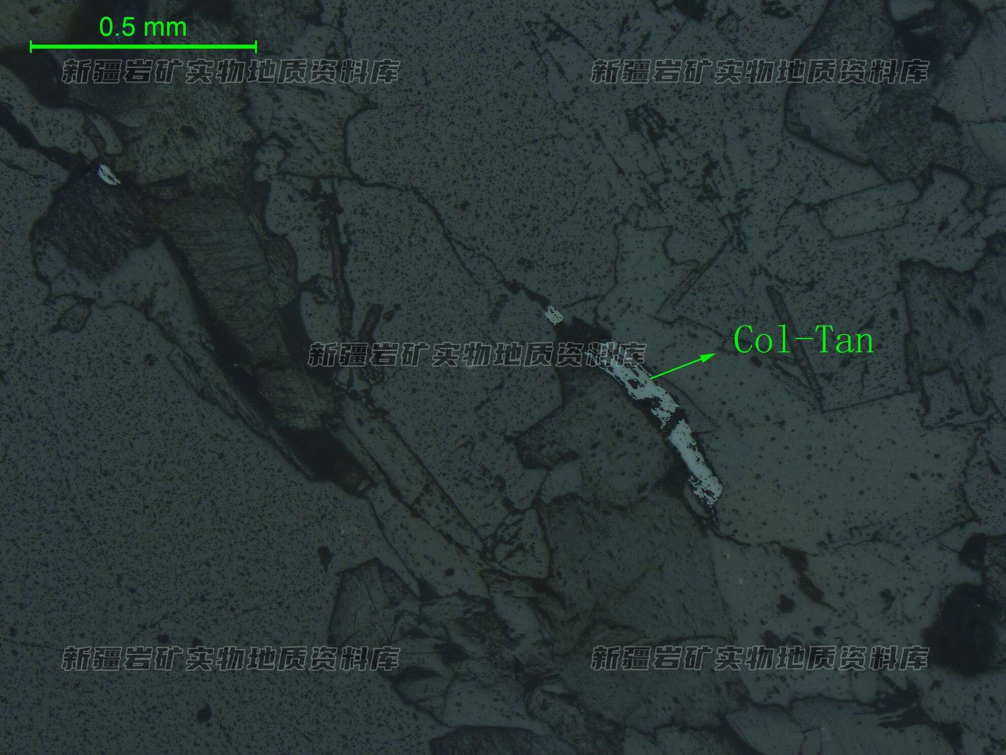 岩石特征描述: 光片中不透明矿物为铌钽铁矿(Col-Tan),呈细长板条状,不均匀星点浸染状分布透明矿物之间,个别粒度略粗。