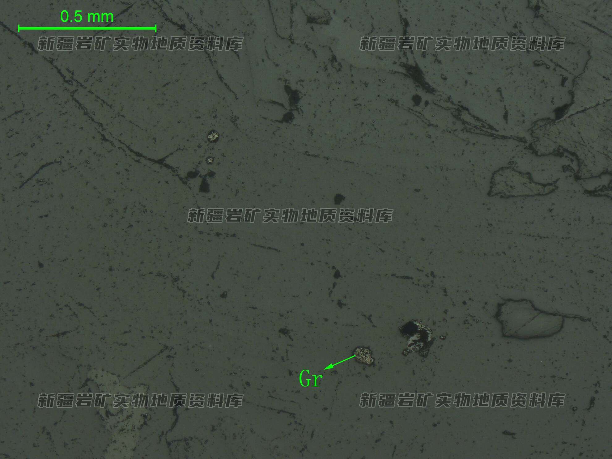 岩石特征描述: 光片中分布极微量微细板状石墨(Gr),分布不均匀,多分布局部透明矿物之间。