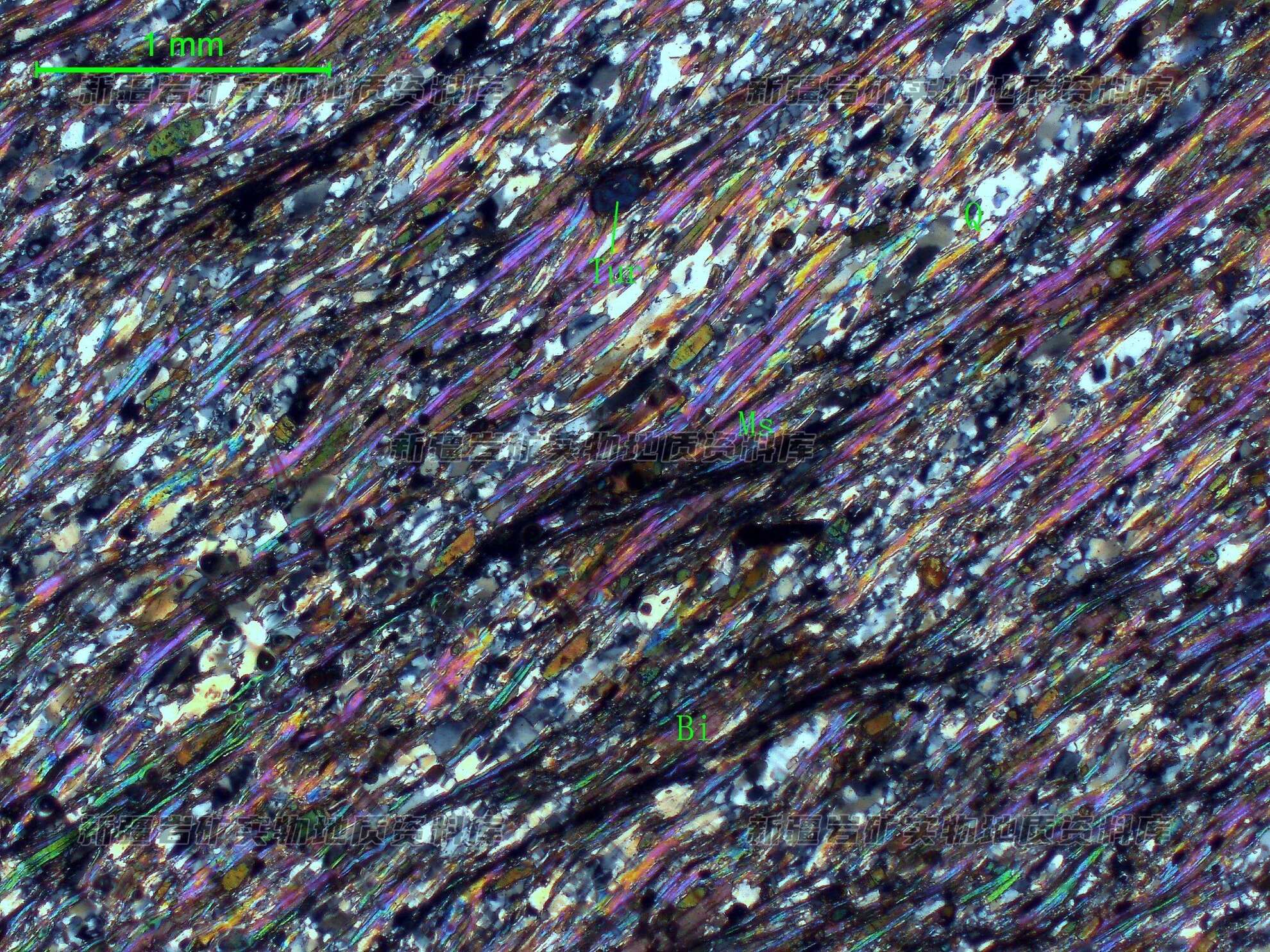 岩石特征描述: 岩石具片状构造,石英(Q)压扁拉长呈微晶集合体长条平行定向分布,黑云母(Bi)及白云母(Ms)呈细条带状变形拉长分布,可见电气石(Tur)晶粒。