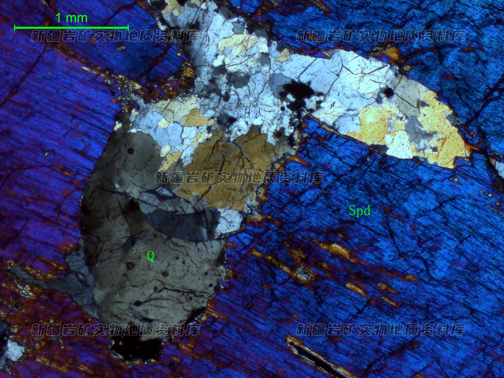 岩石特征描述: 锂辉石(Spd)呈半自形柱状、短柱状,长轴定向分布,结晶较粗大,在锂辉石孔隙之间,分布细粒状石英(Q)、斜长石集合体。