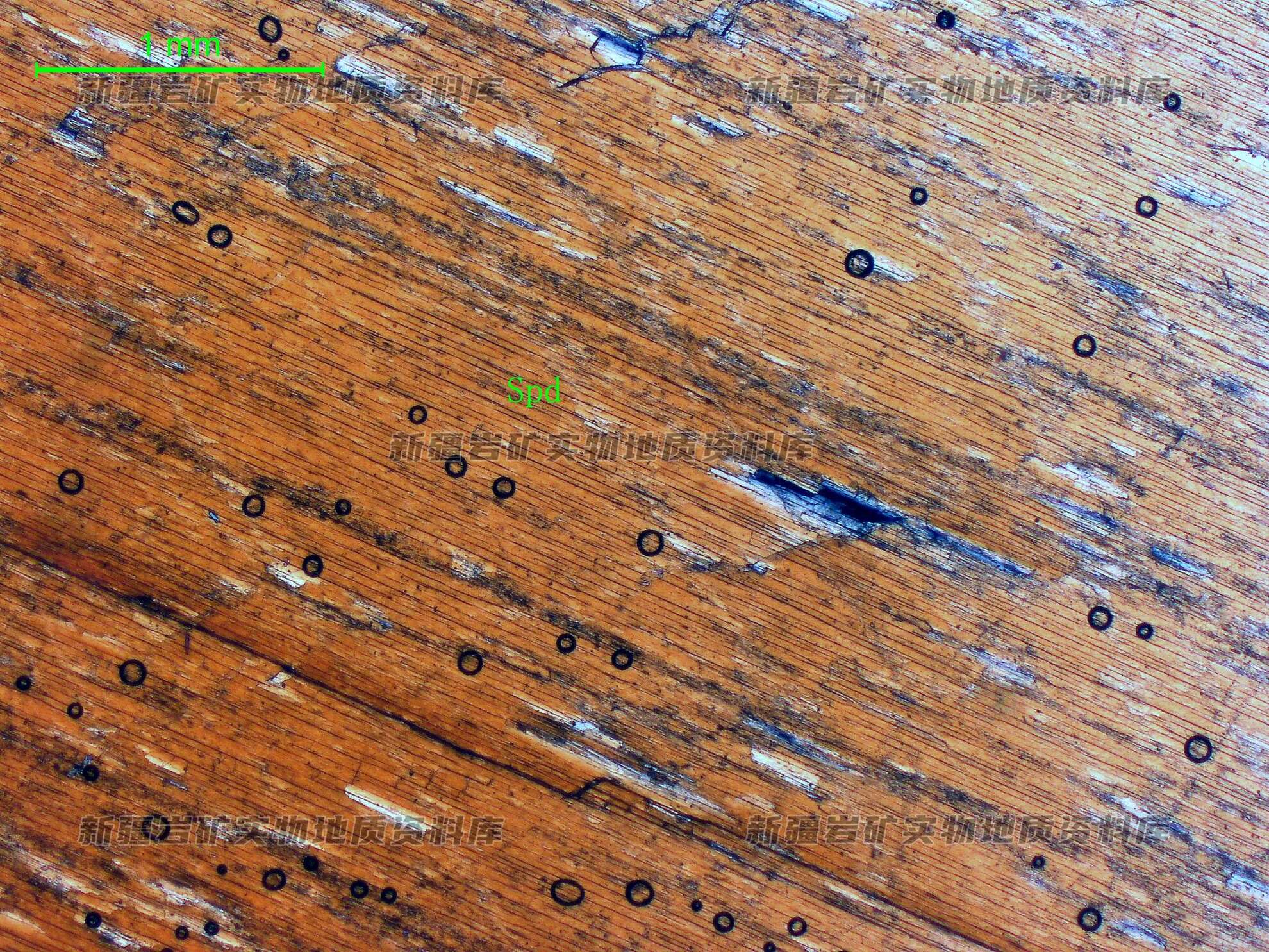 薄片中只见一柱状锂辉石(Spd)晶粒。 岩石薄片中只磨到一粒柱状锂辉石。长柱方向16mm,参照手标本,柱状锂辉石定向分布,其他矿物没有观察到。