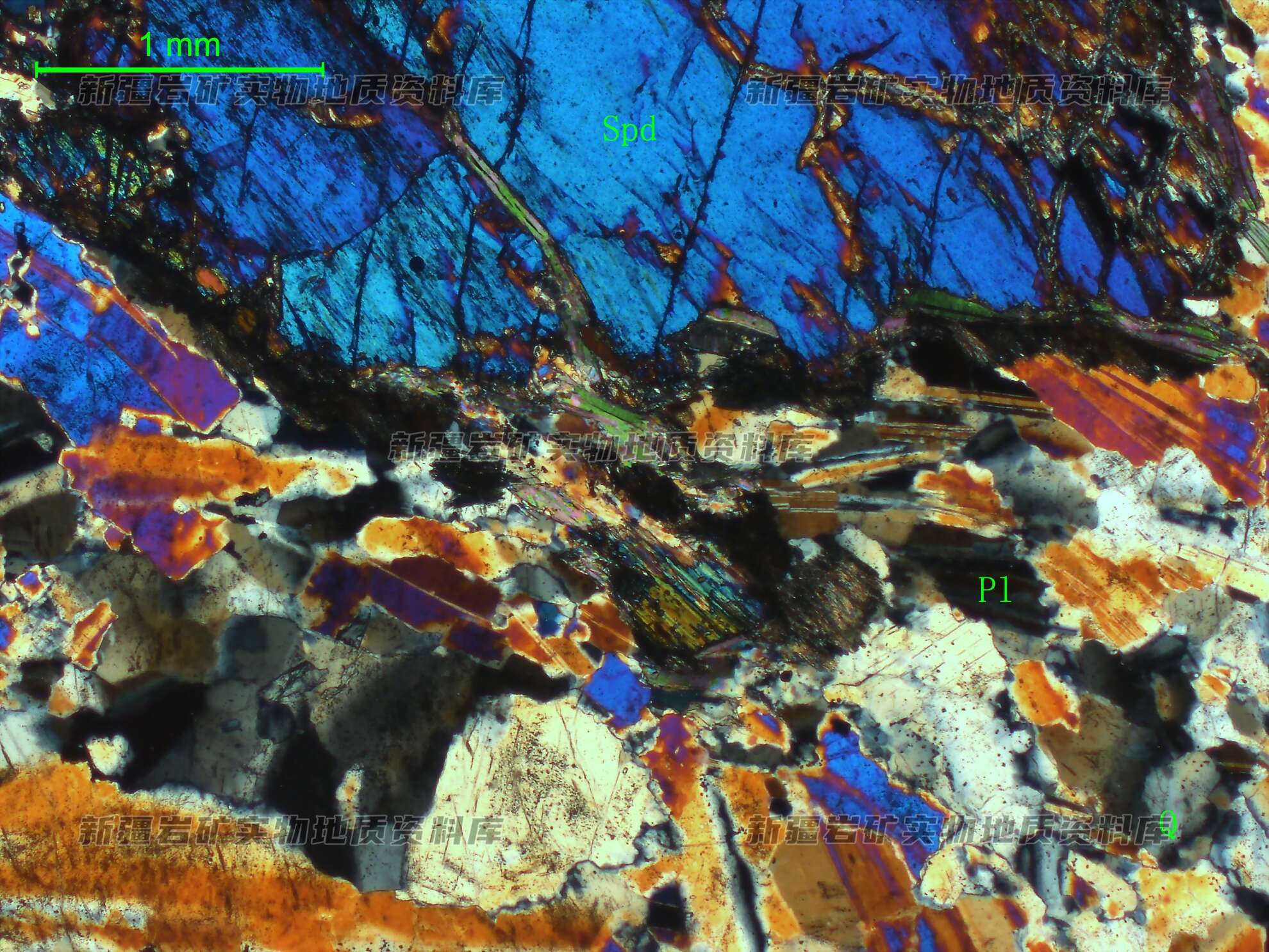 岩石特征描述: 斜长石(Pl)呈半自形-自形板状,其间不均匀分布少量他形粒状石英(Q),锂辉石(Spd)呈半自形柱状。