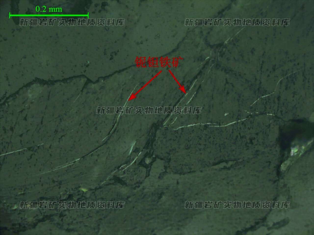 岩石特征描述: 偶见铌钽铁矿呈细线状分布于透明矿物内部。