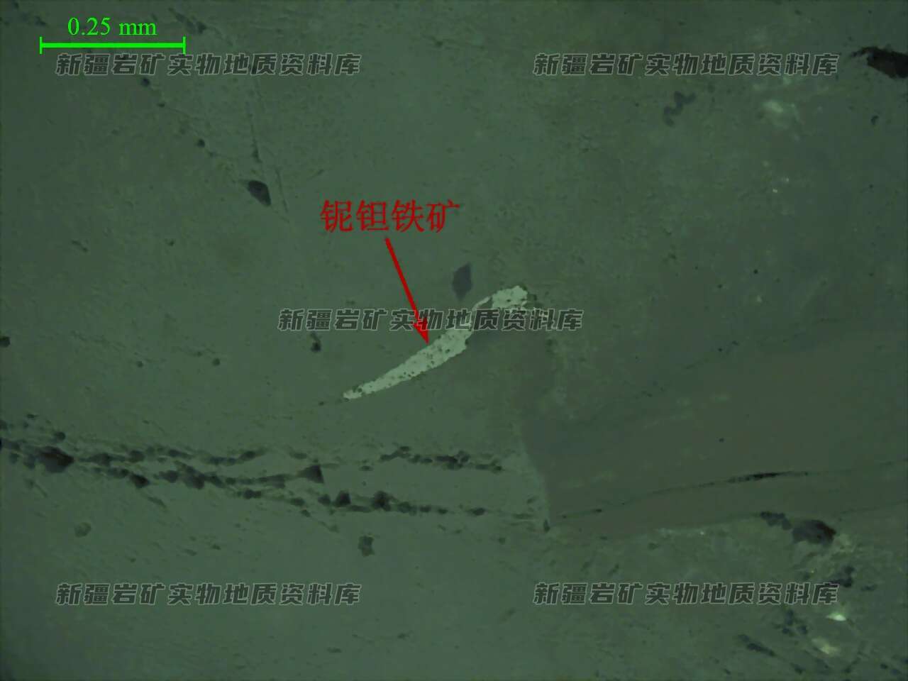 岩石特征描述: 光片中偶见个别铌钽铁矿、石墨颗粒,含量极少。