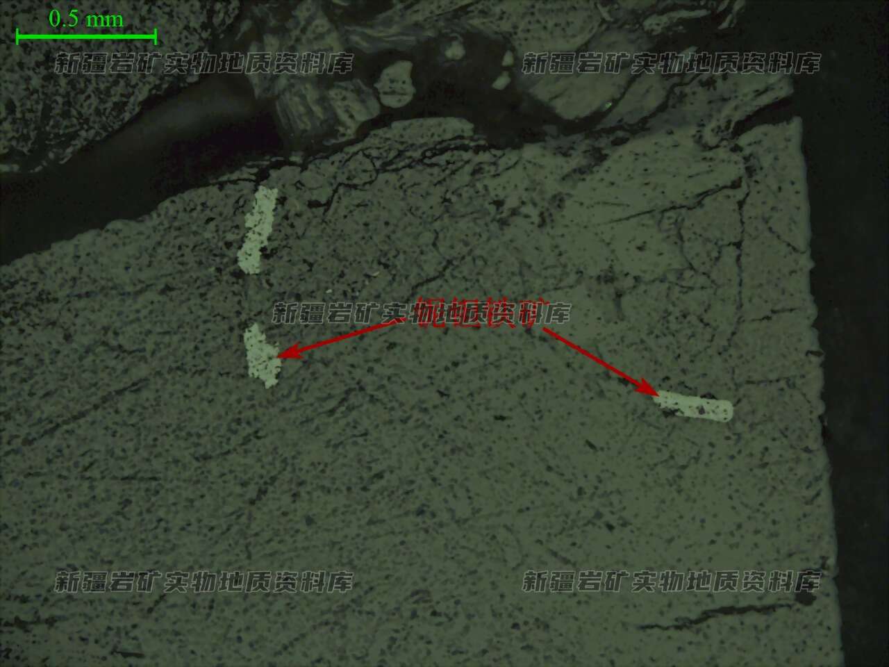 偶见黄铁矿呈细长条状,粒径约0.16mm,分布于岩石裂隙。
