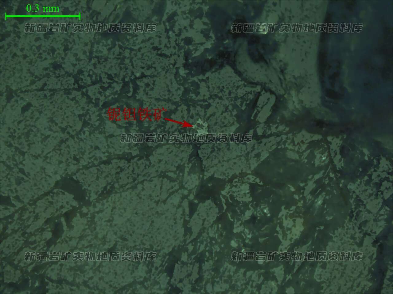 光片中偶见个别铌钽铁矿呈细小不规则粒状,粒径0.06mm,包裹于透明矿物内部,未见其他金属矿物分布。