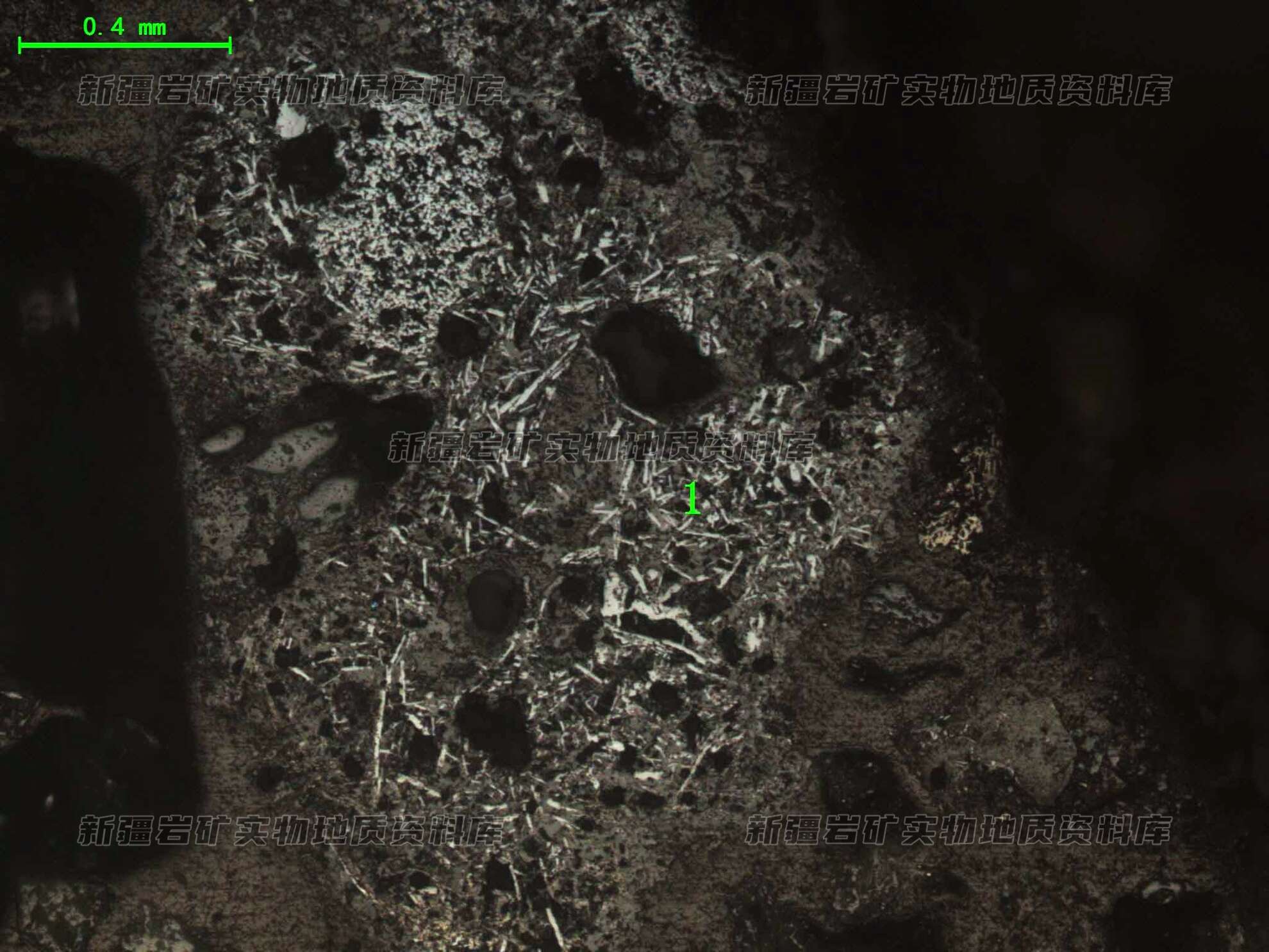 见针状晶体(1)杂乱分布残渣中。