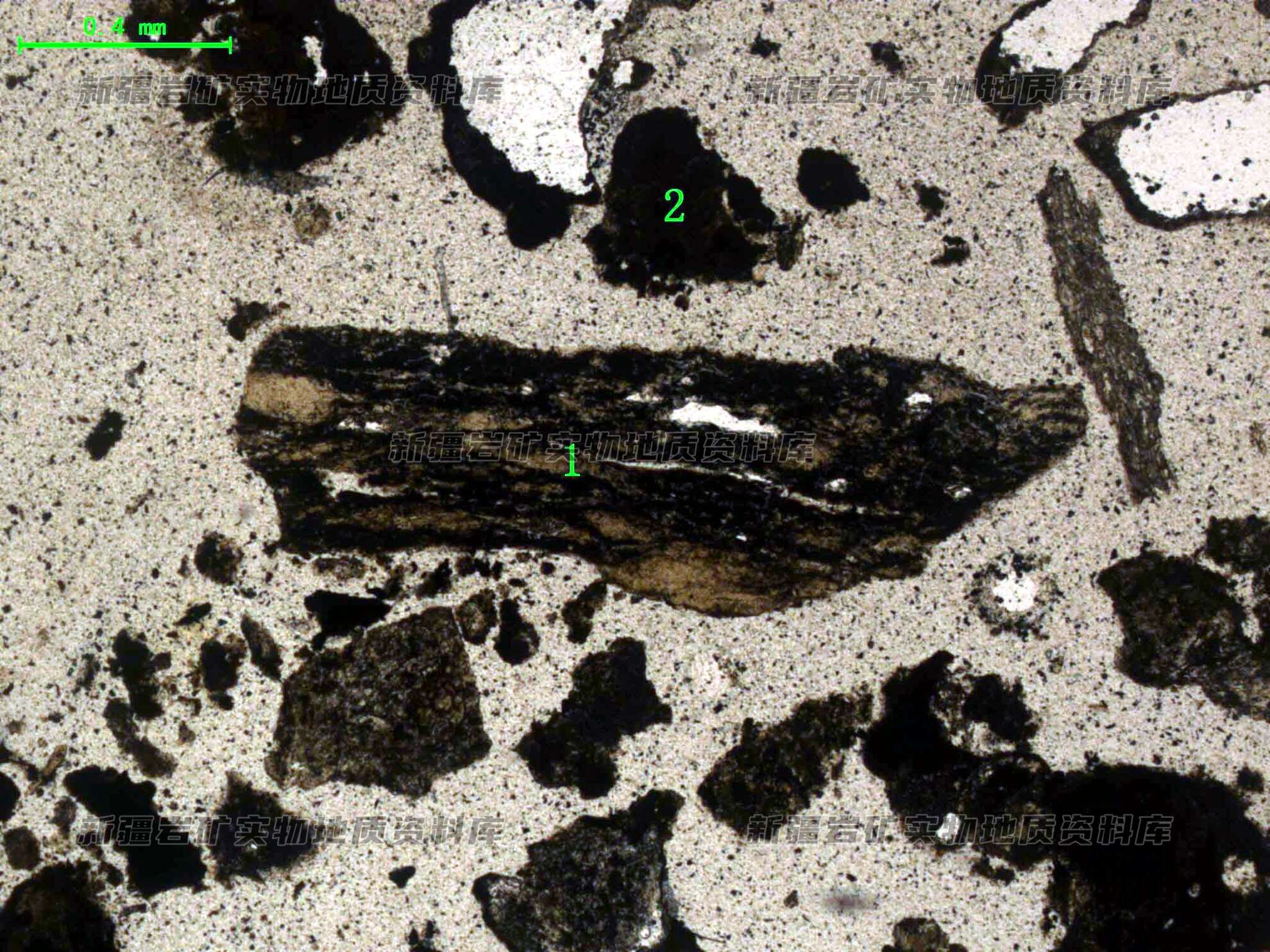 样品中见片状残炭(1)的条带状结构,见残渣(2)呈次棱角状。