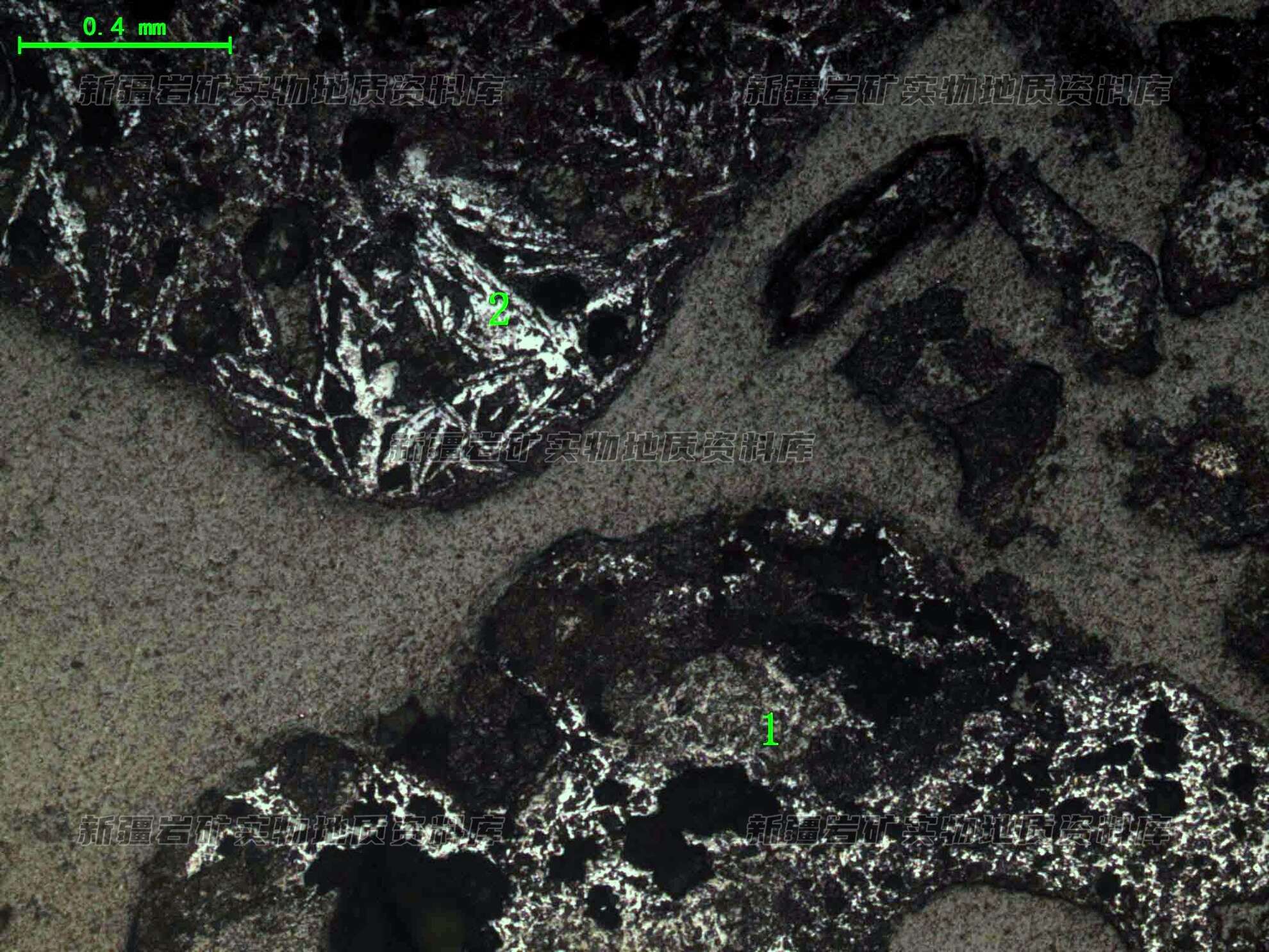 见残渣(1)内局部见残炭,另见少量有针状晶体(2)呈交织结构。
