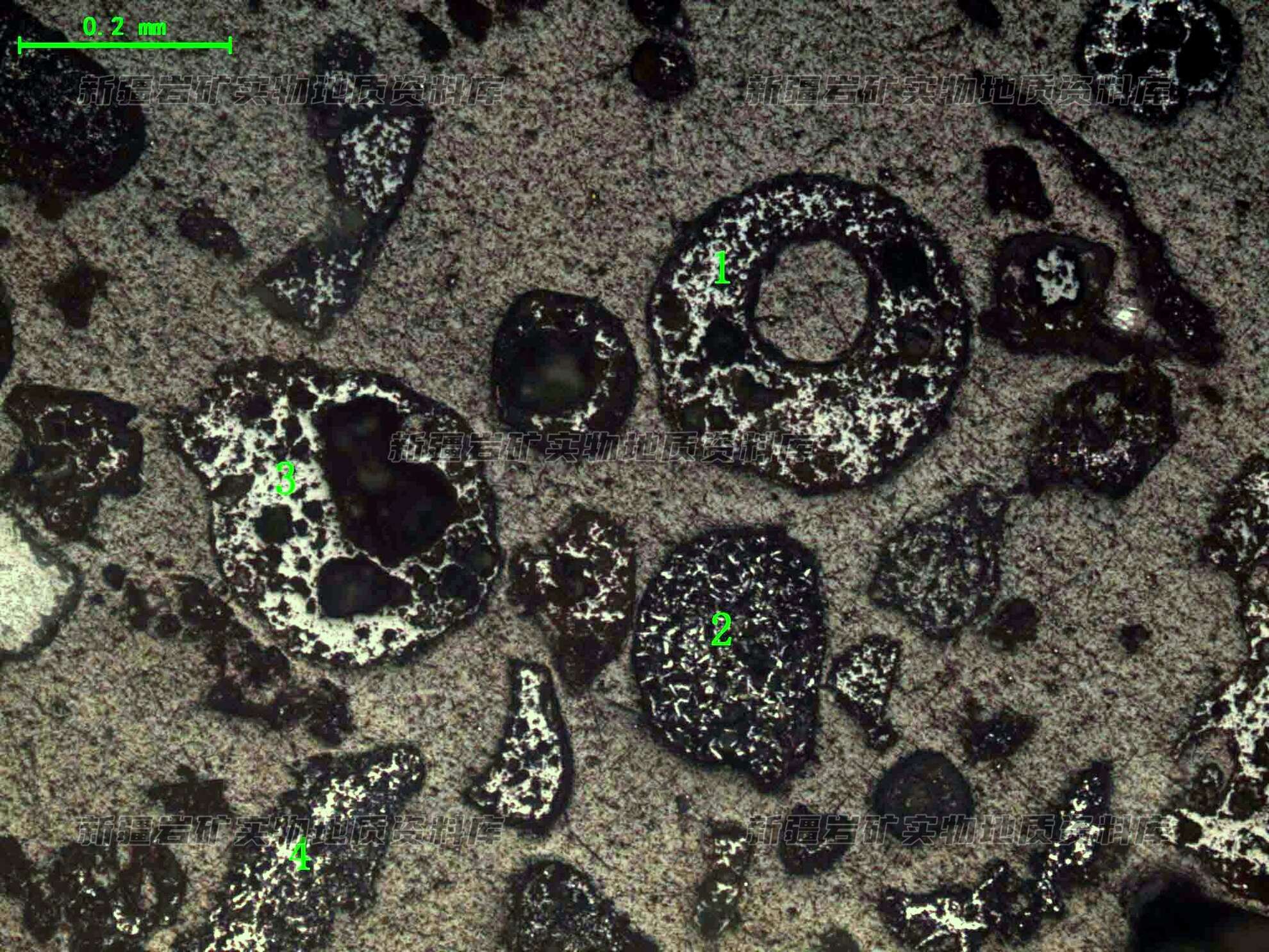 残渣(2)呈次圆状,见玻璃质球体(1)内部中空,部分内部见孔洞(3)。
