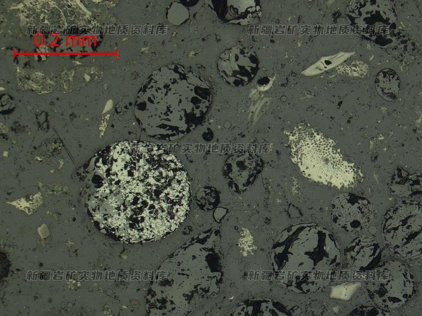 左侧是玻璃质和金属矿物结合的圆球,右侧碎片状残炭保留植物网眼状细胞结构。
