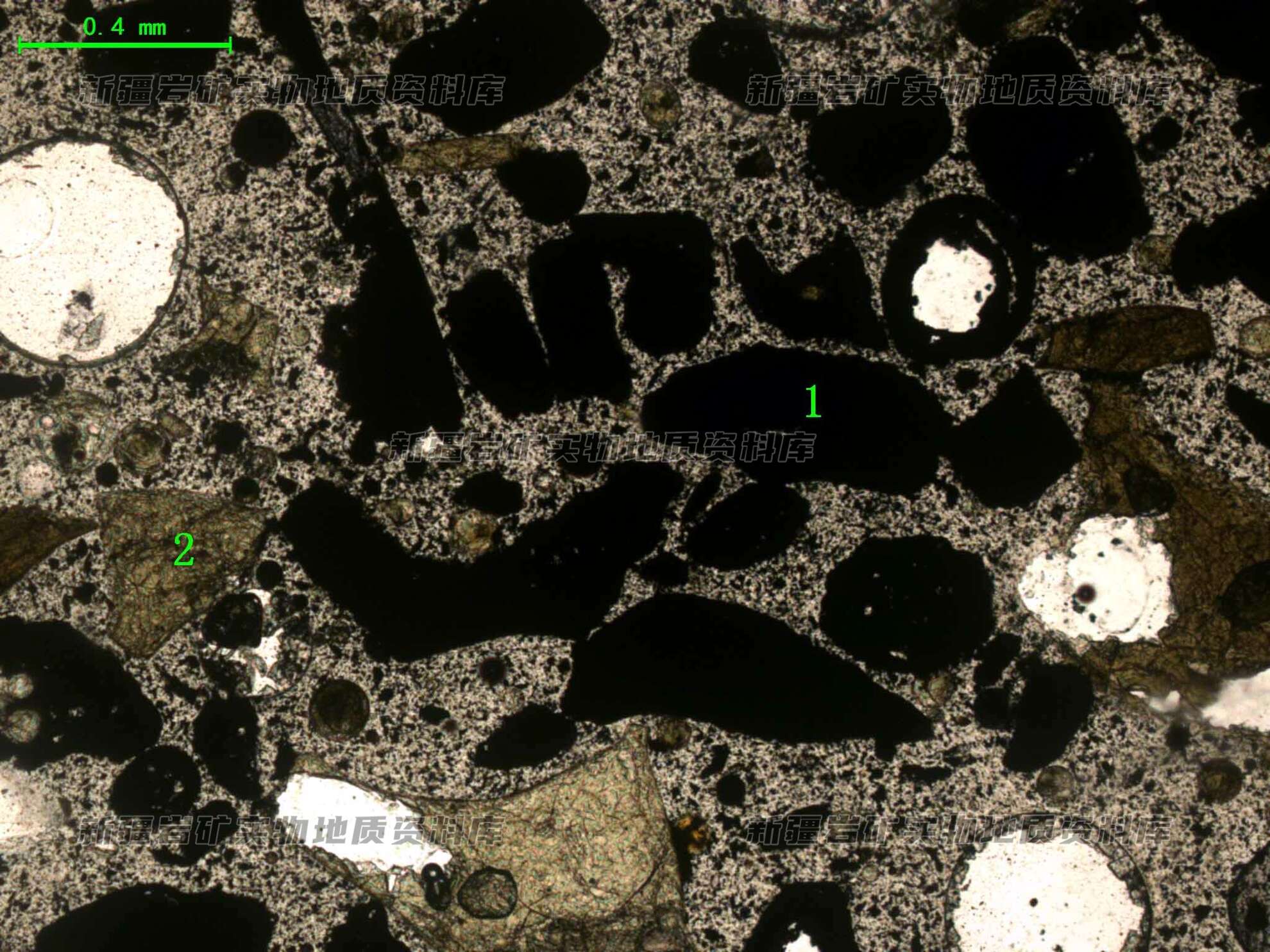 光片中残渣(1)呈次棱角状,玻璃(2)表面粗糙。