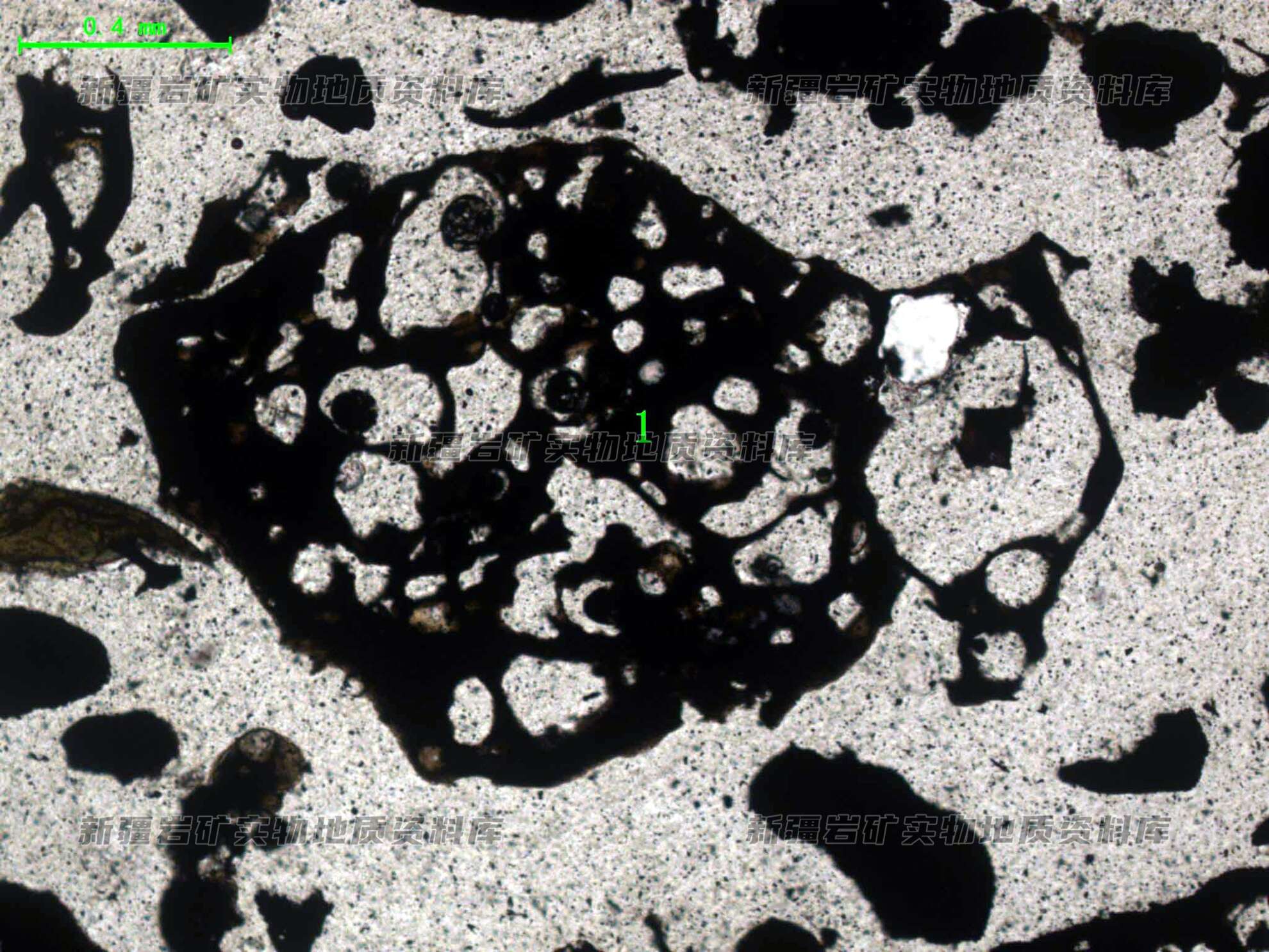 样品中焙烧后膨胀的残渣(1)呈次浑圆棱角状,块体内部结构较松散,孔洞较大。