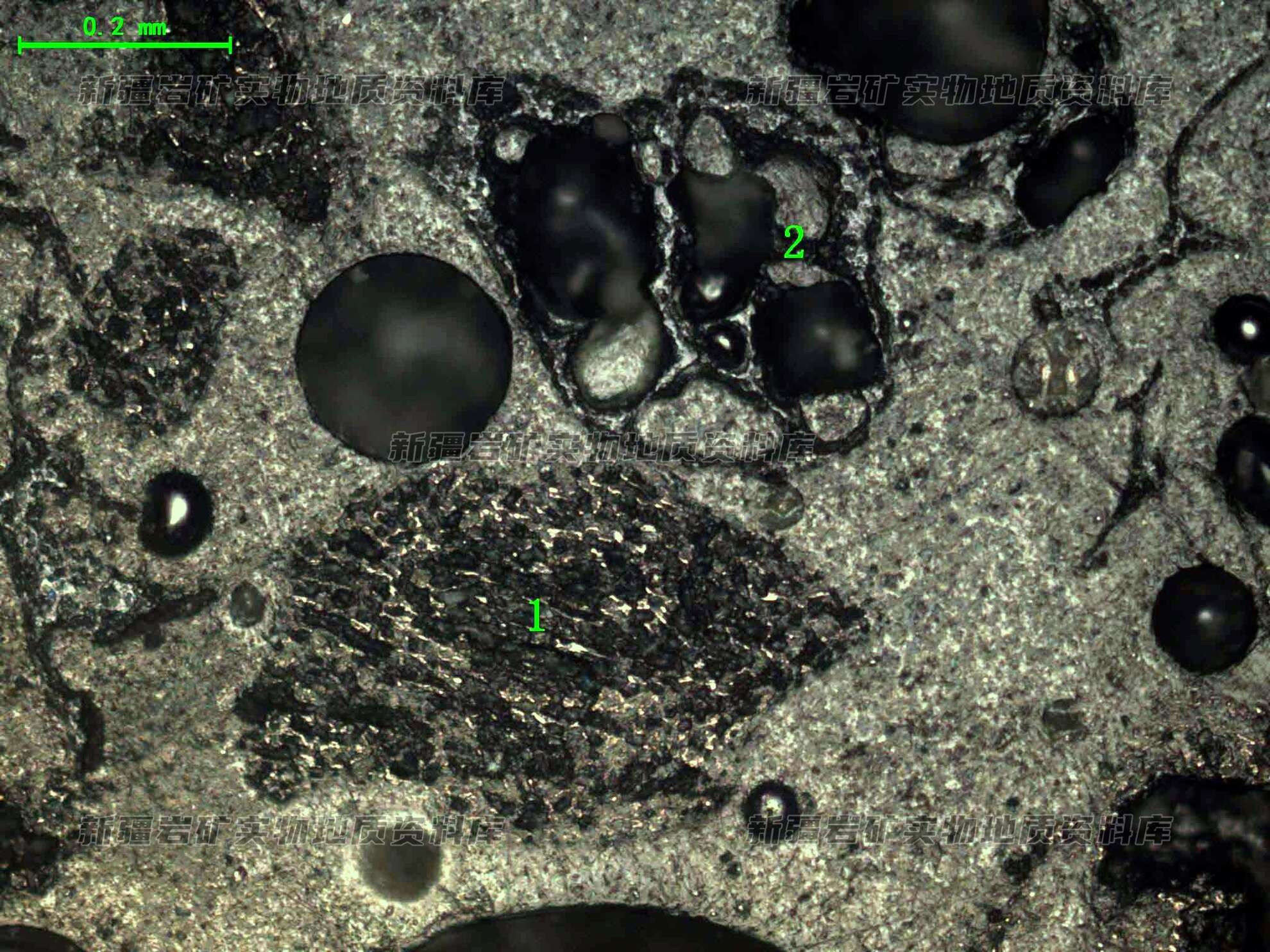 光片中残炭(1)呈片状,未见膨胀,内部见条带尚可见,膨胀残渣(2)呈孔洞结构。