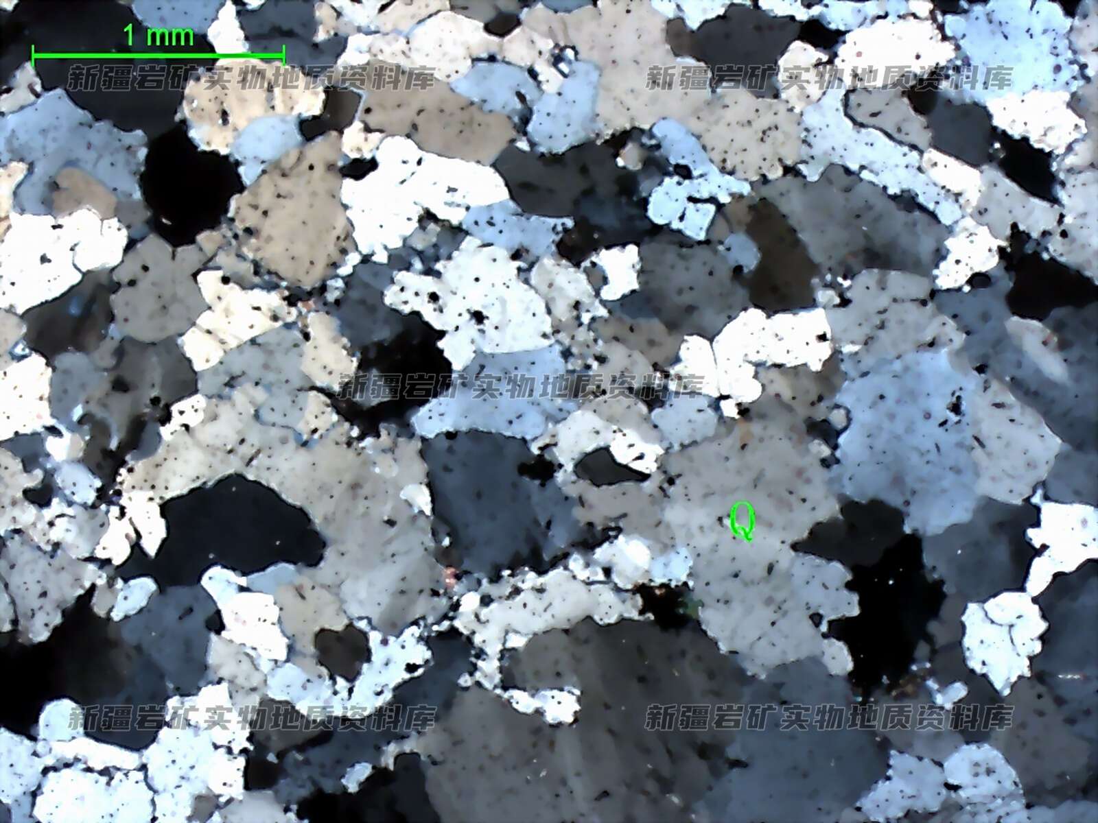 岩石特征描述: 石英(Q)呈他形粒状,边缘呈锯齿状、不规则状紧密镶嵌,表面干净,多具波状消光。岩石具细粒变晶结构,主要由石英组成。石英呈他形粒状,边缘呈锯齿状、不规则状紧密镶嵌,表面干净,多具波状消光,粒径多在0.2-1mm,含量约98-99%;其次含有微量的云母、重矿物及黄铁矿,粒径微小,含量约1-2%。
